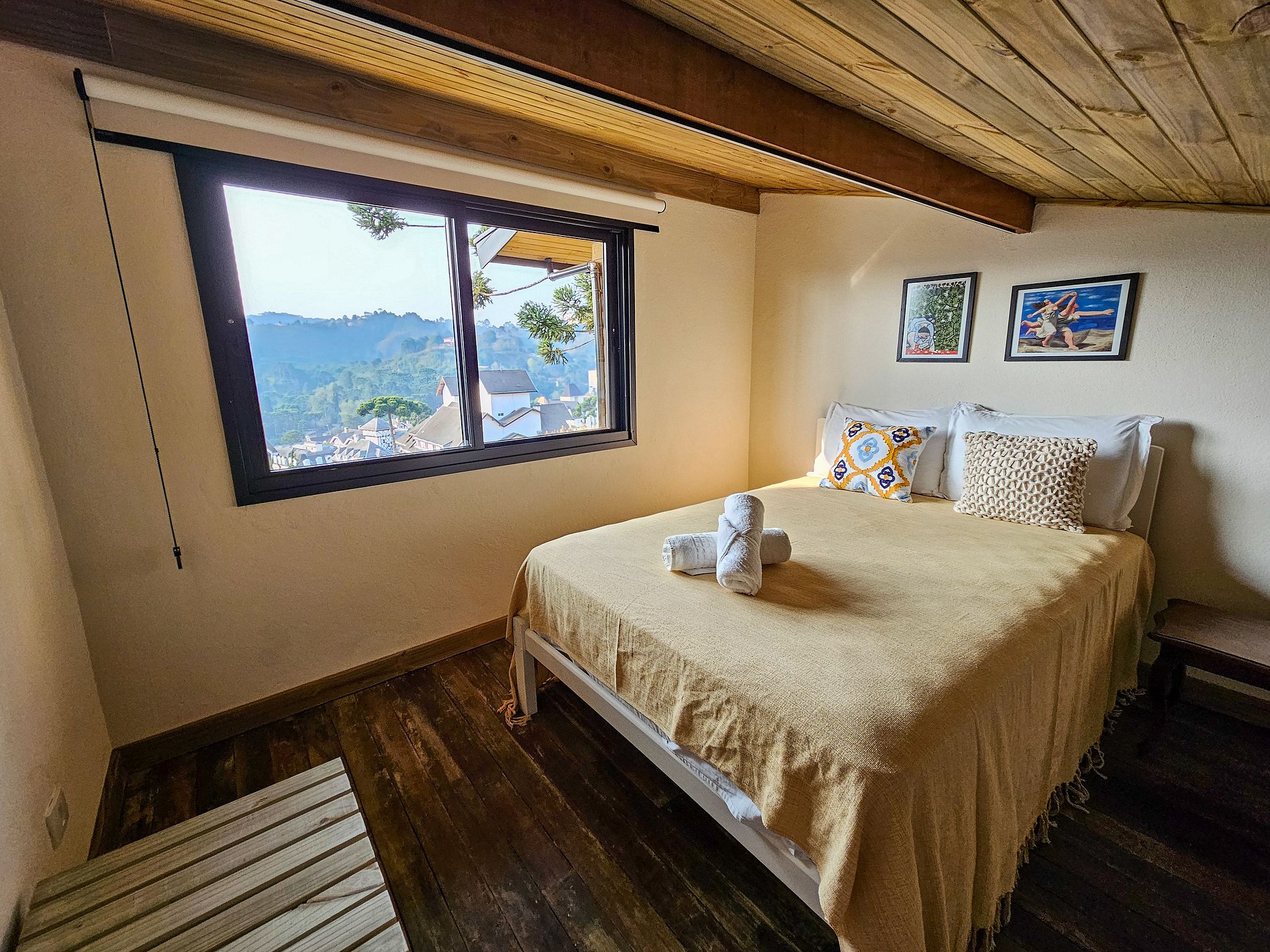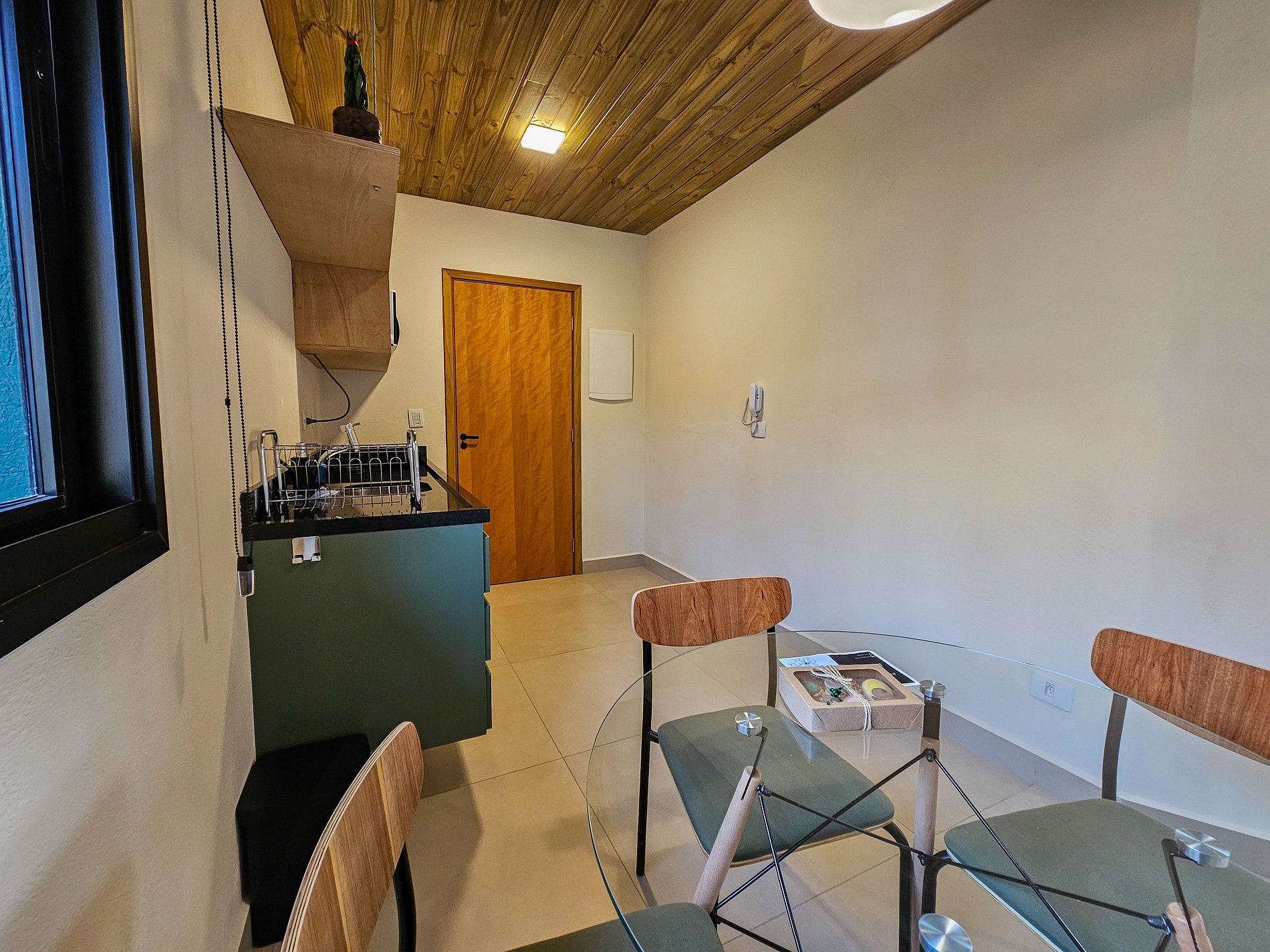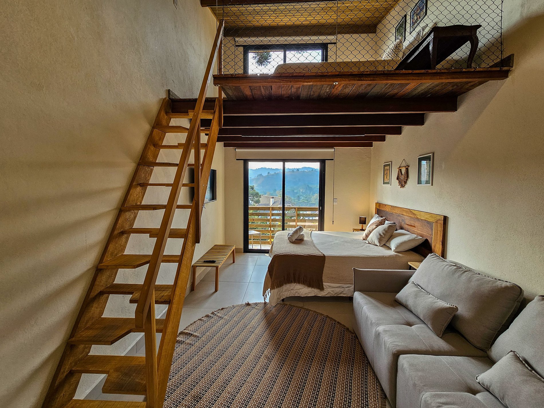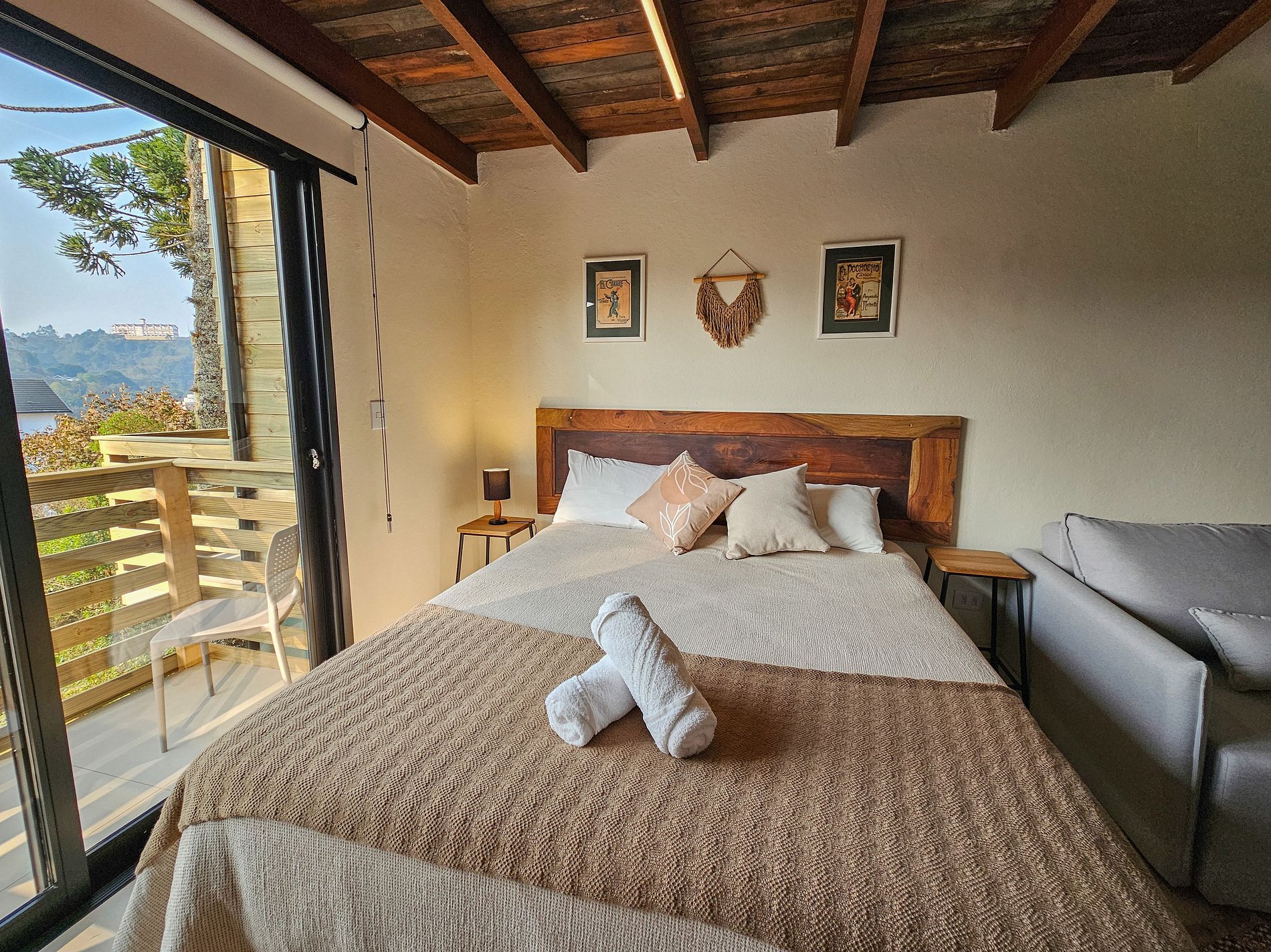 Nosso estúdio novo e moderno está localizado no coração do centro turístico do Capivari, composto por 1 suíte e 1 quarto suspenso com 1 cama de casal em cada para casais e famílias. Contamos com uma pequena sala de estar e cozinha equipada. Disponibilizamos roupa de cama e banho completo. Temos estacionamento cortesia no local. Disponibilizamos de internet wi-fi e possuímos TV smart. Contamos também com uma sala de estar de uso comum com lareira e jogos.
