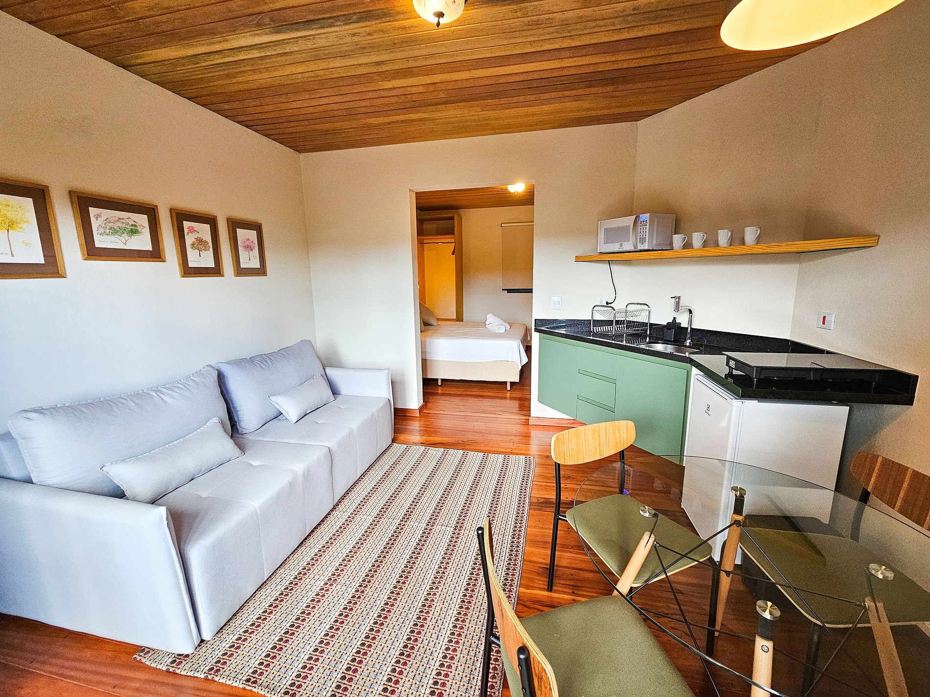 Nosso estúdio novo e moderno está localizado no coração do centro turístico do Capivari, composto por 1 suíte. Contamos com uma pequena sala de estar e cozinha equipada. Disponibilizamos roupa de cama e banho completo. Temos estacionamento cortesia no local. Disponibilizamos de internet wi-fi e possuímos TV smart. Contamos também com uma sala de estar de uso comum com lareira e jogos.