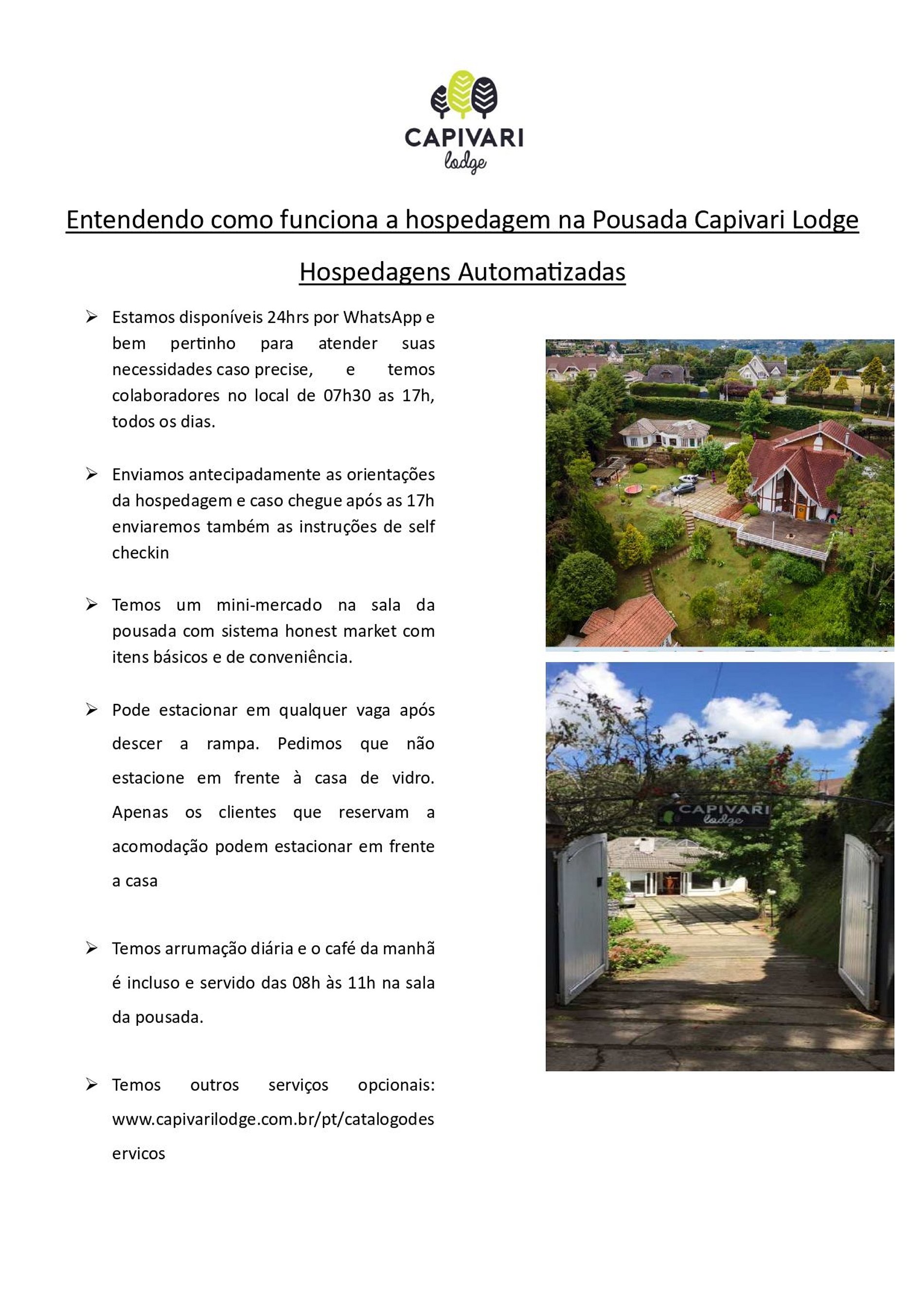 É um imenso prazer recebe-los no Capivari Lodge. Cuidamos de tudo nos menores detalhes para garantir que tenha uma experiência memorável conosco. Nós queremos cuidar de você e por isso temos serviços “on demand” como café da manhã, massagem, fondue entre outros. Venha desfrutar de acomodações confortáveis e a mais bela vista da região. Estamos à disposição durante toda sua estadia, iremos recebe-los no check in e check out e disponível por whatsapp sempre que precisar.