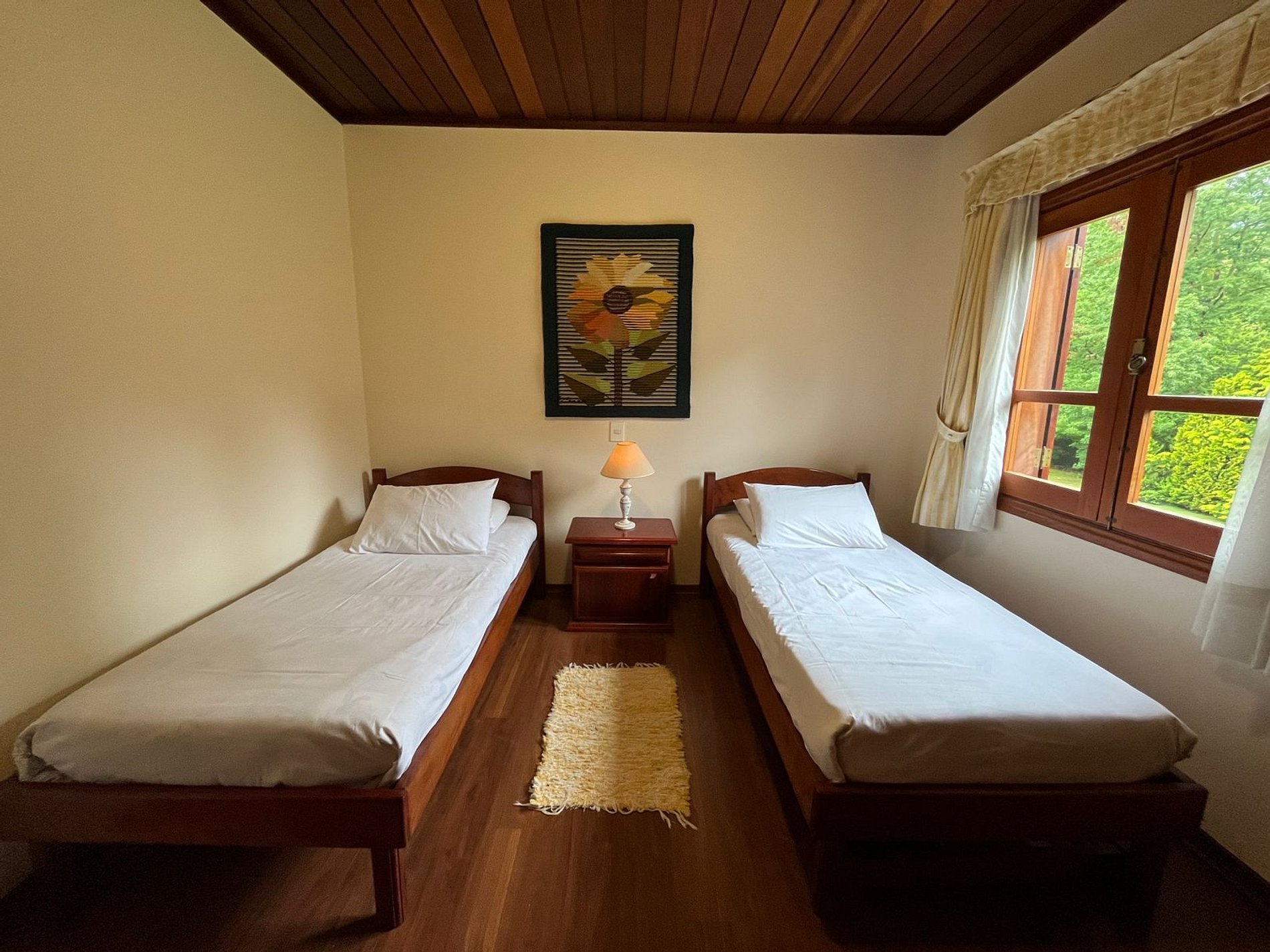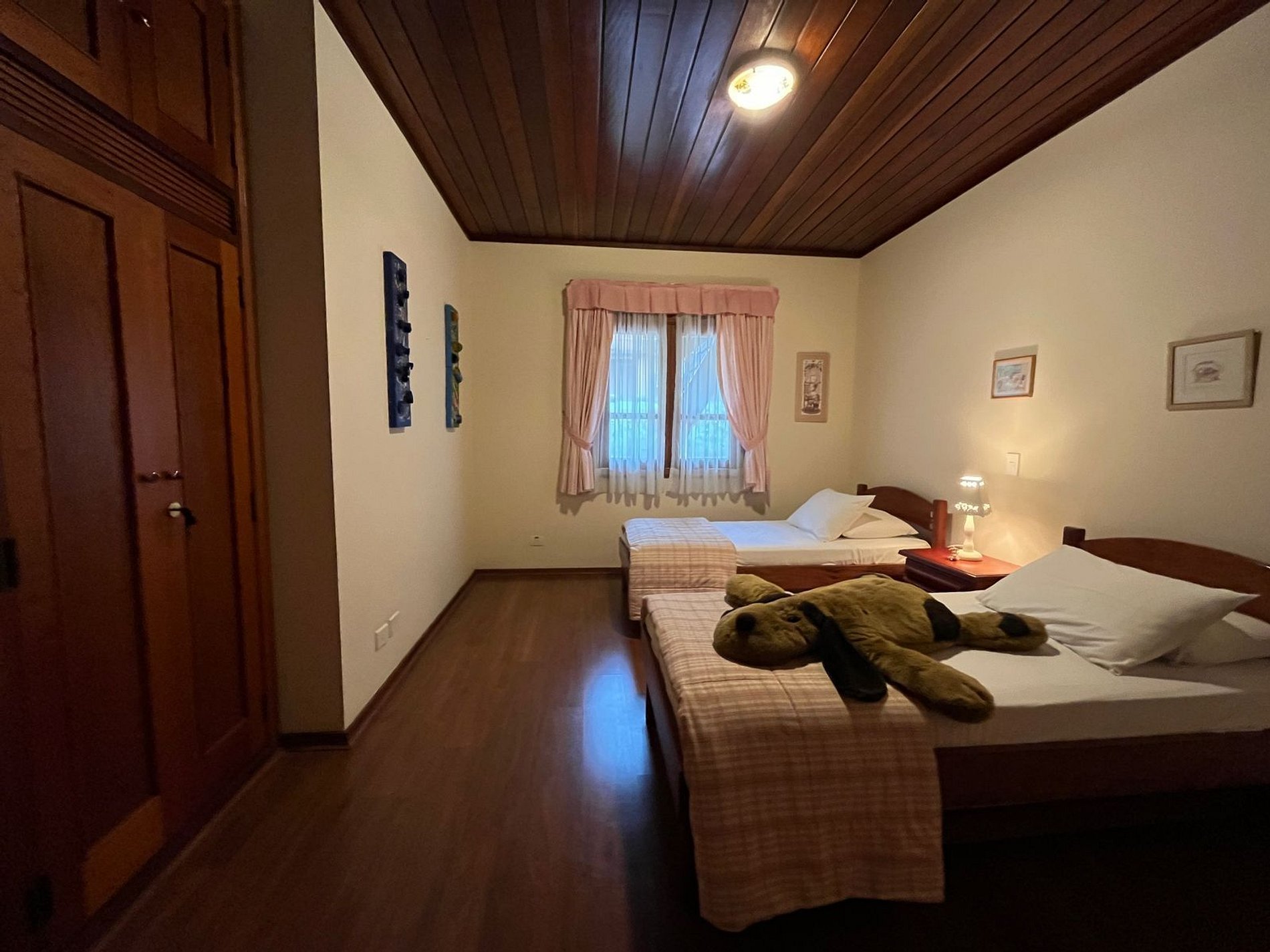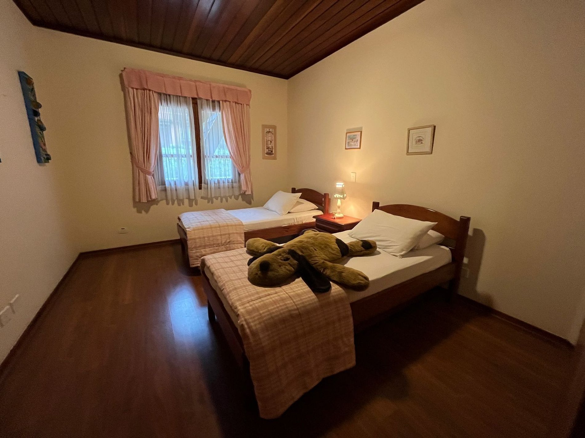 No andar de baixo temos mais uma suíte com cama de casal e mais dois quartos com 2 camas de solteiro e um banheiro.