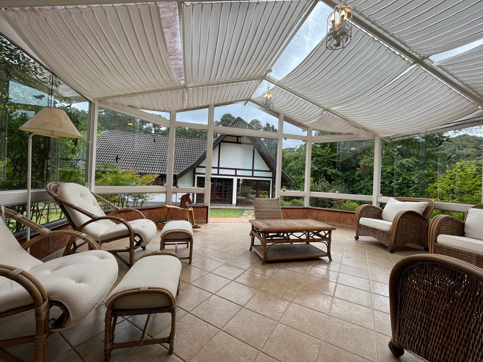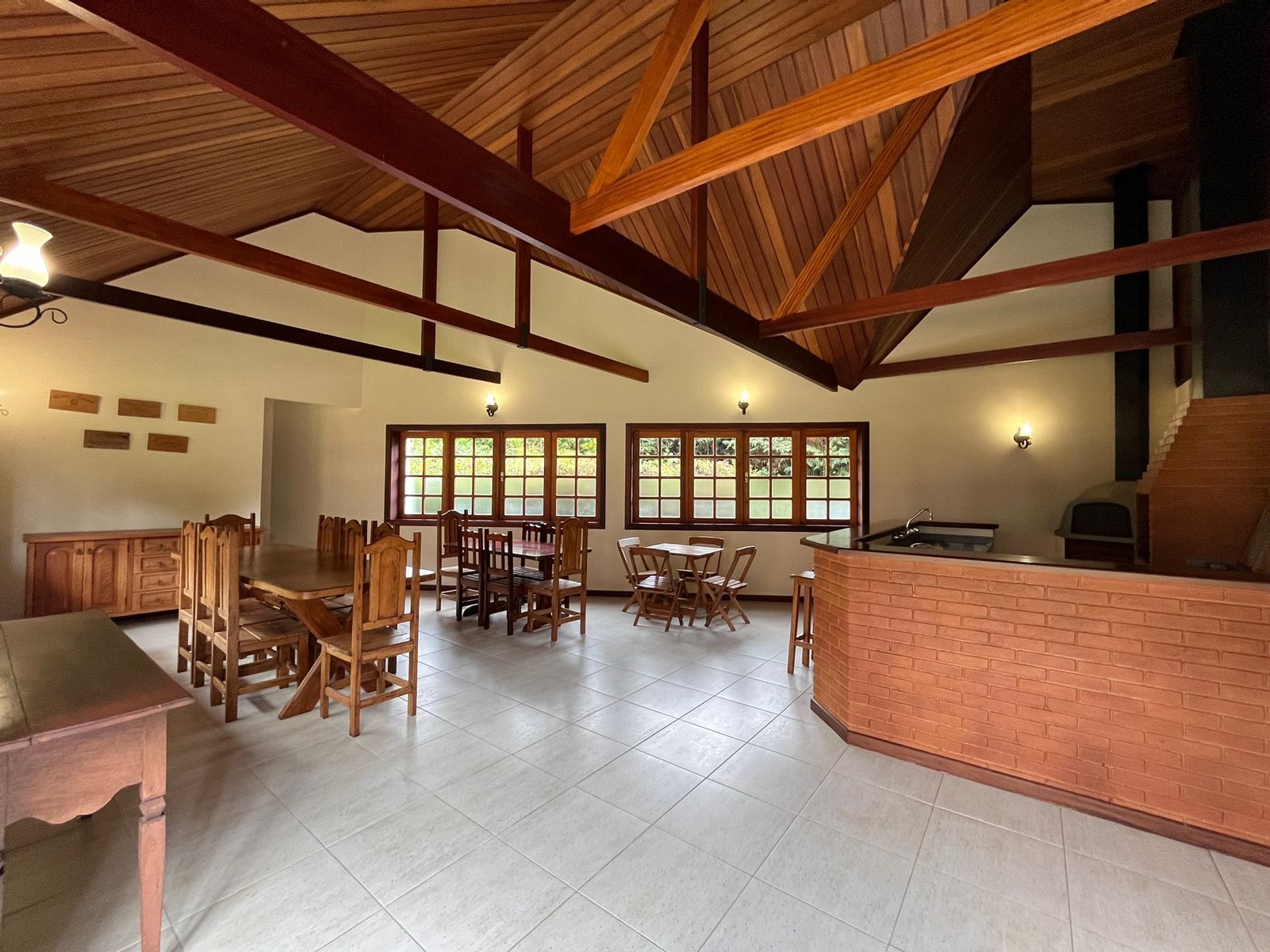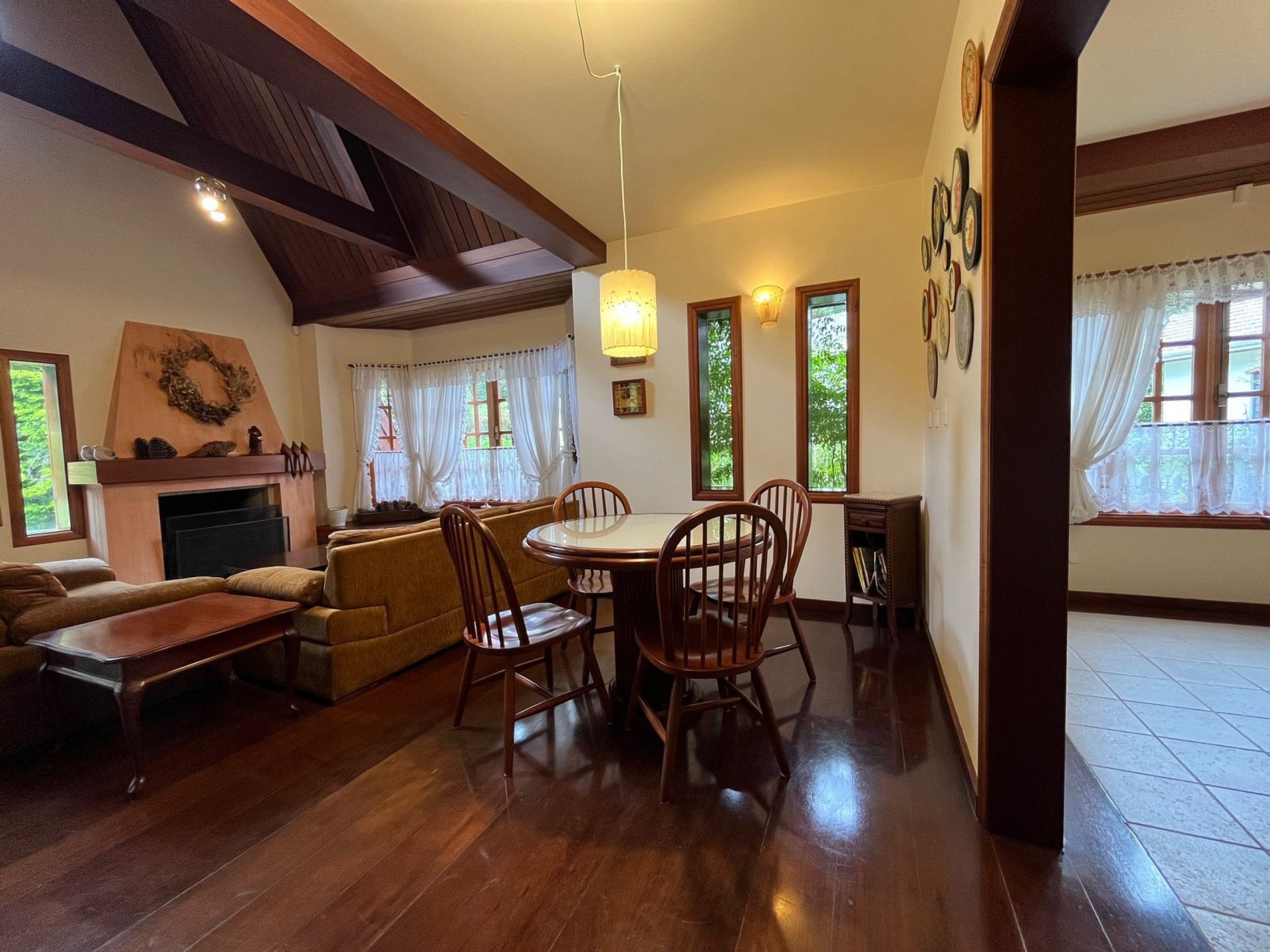 Temos uma cozinha completa, sala de estar com lareira e mesa de jogos, sala de jantar , sala de TV com claraboia e na parte externa do imóvel temos um gazebo para descanso e linda vista para o jardim, área gourmet com fogão, forno de pizza a lenha, churrasqueira e lavabo e um super aconchegante redário.