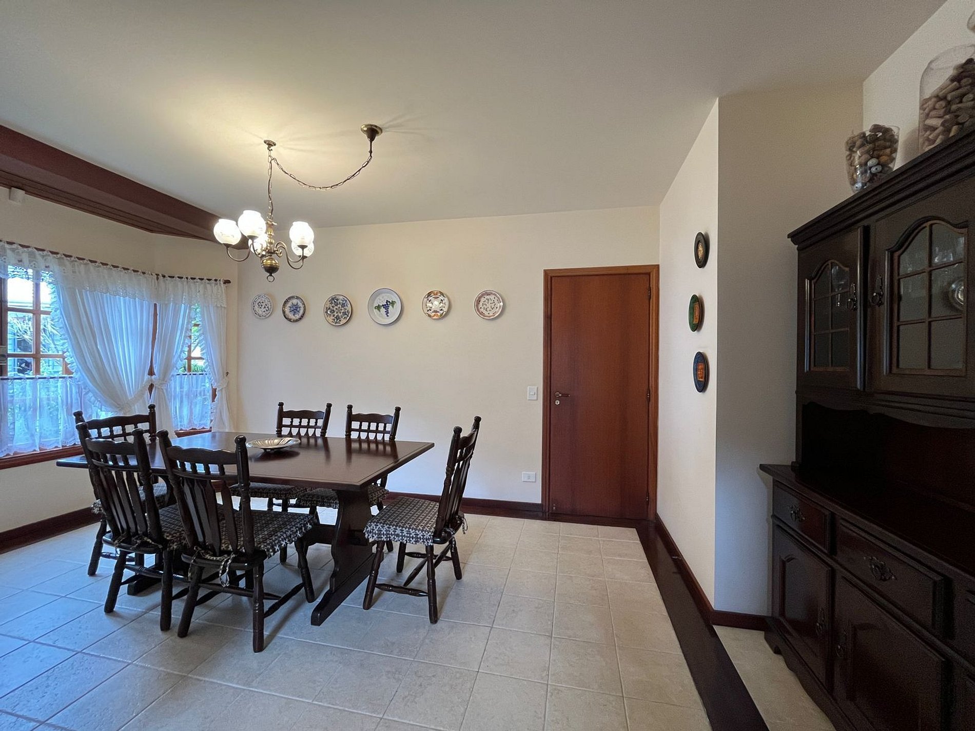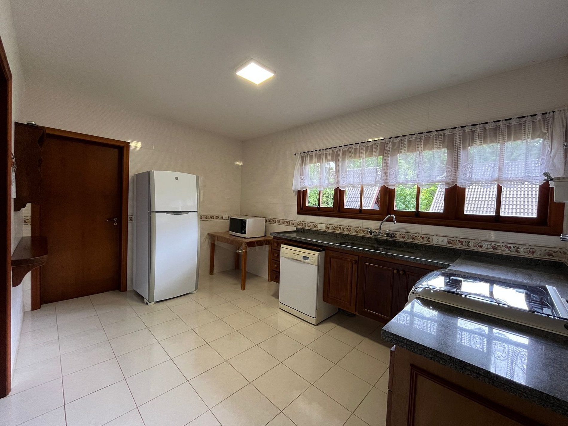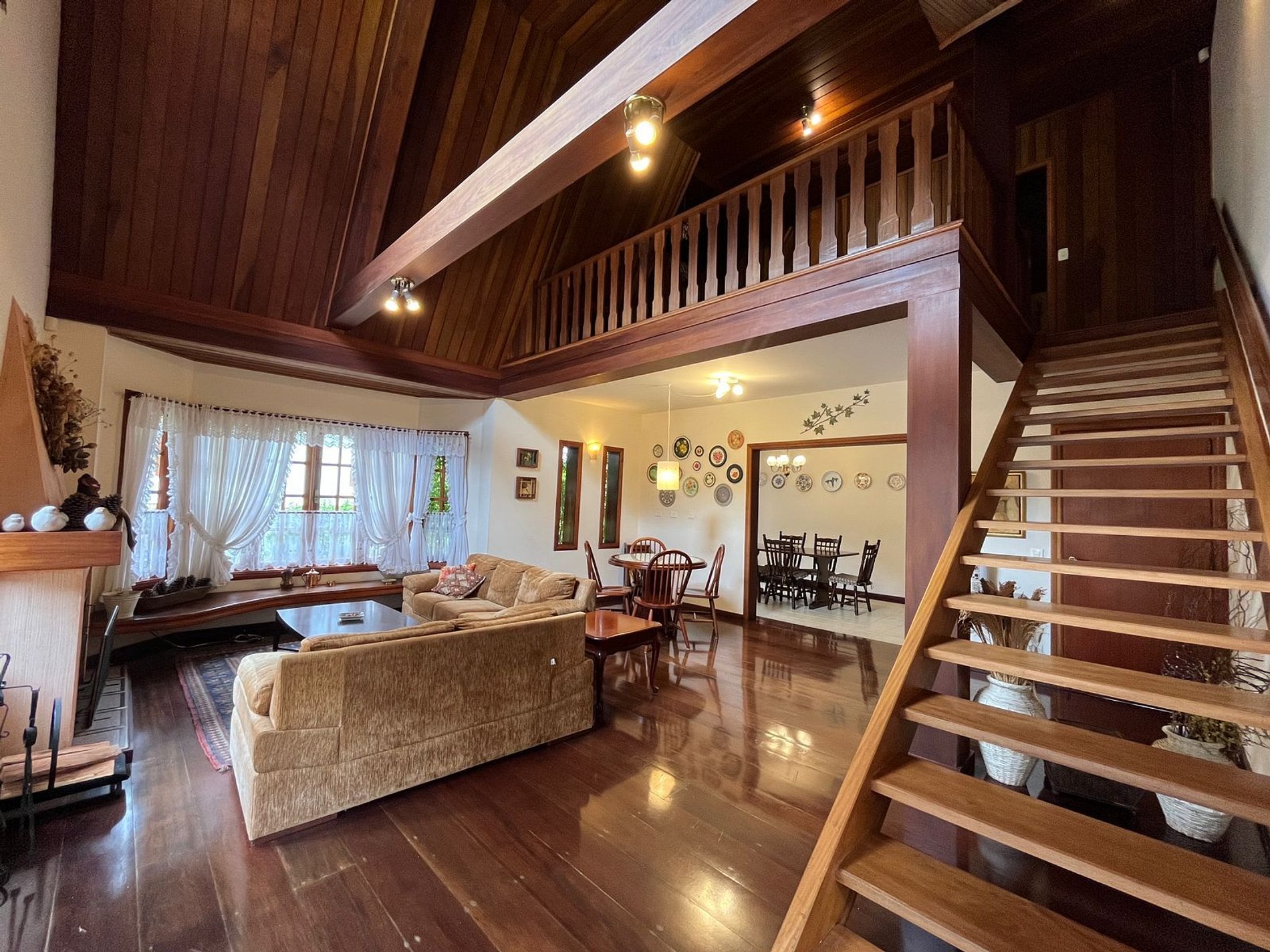 Temos uma cozinha completa, sala de estar com lareira e mesa de jogos, sala de jantar , sala de TV com claraboia e na parte externa do imóvel temos um gazebo para descanso e linda vista para o jardim, área gourmet com fogão, forno de pizza a lenha, churrasqueira e lavabo e um super aconchegante redário.