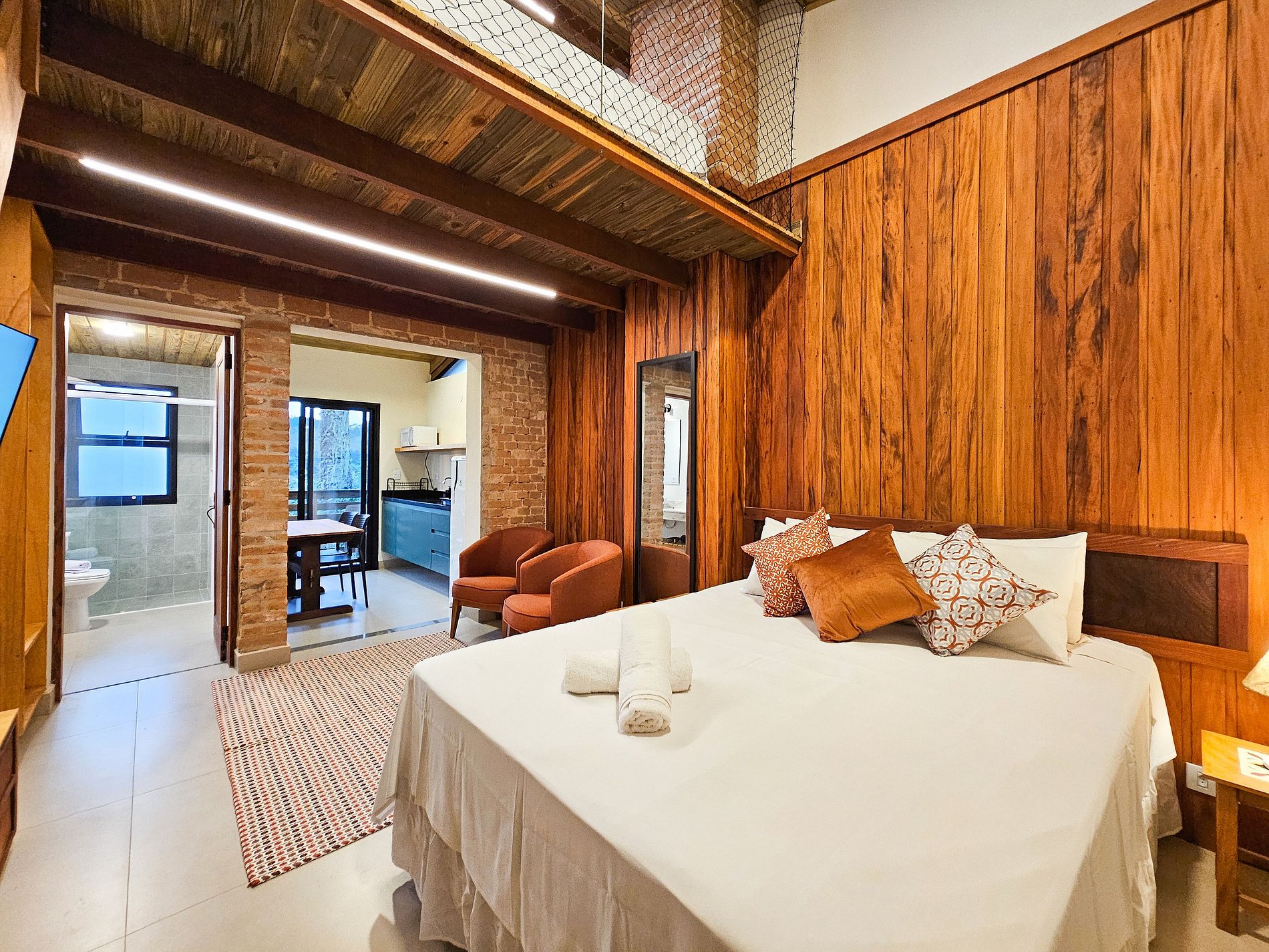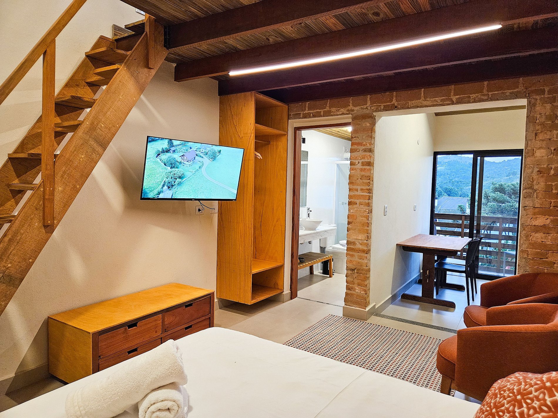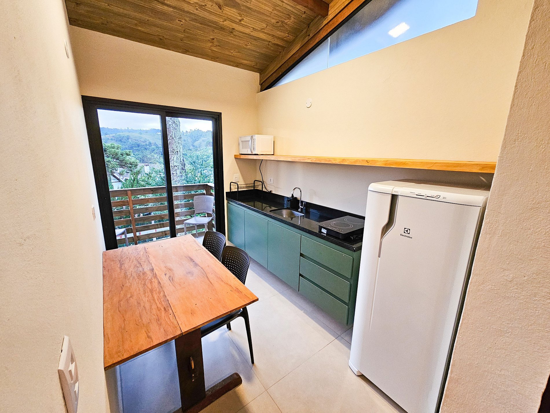 Nosso estúdio novo e moderno está localizado no coração do centro turístico do Capivari, composto por 1 suíte e 1 quarto suspenso com 1 cama de casal em cada para casais e famílias. Contamos com uma pequena sala de estar e cozinha equipada. Disponibilizamos roupa de cama e banho completo. Temos estacionamento cortesia no local. Disponibilizamos de internet wi-fi e possuímos TV smart. Contamos também com uma sala de estar de uso comum com lareira e jogos.