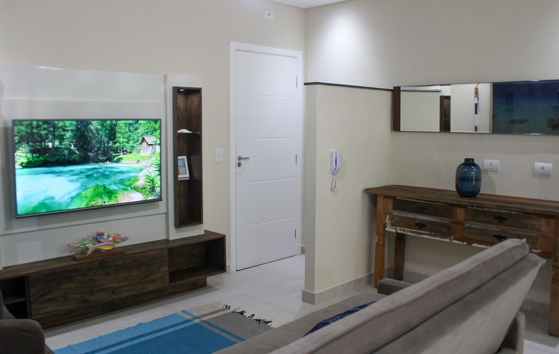A sala de estar possui uma TV SMART e um sofá bem grande e gostoso .