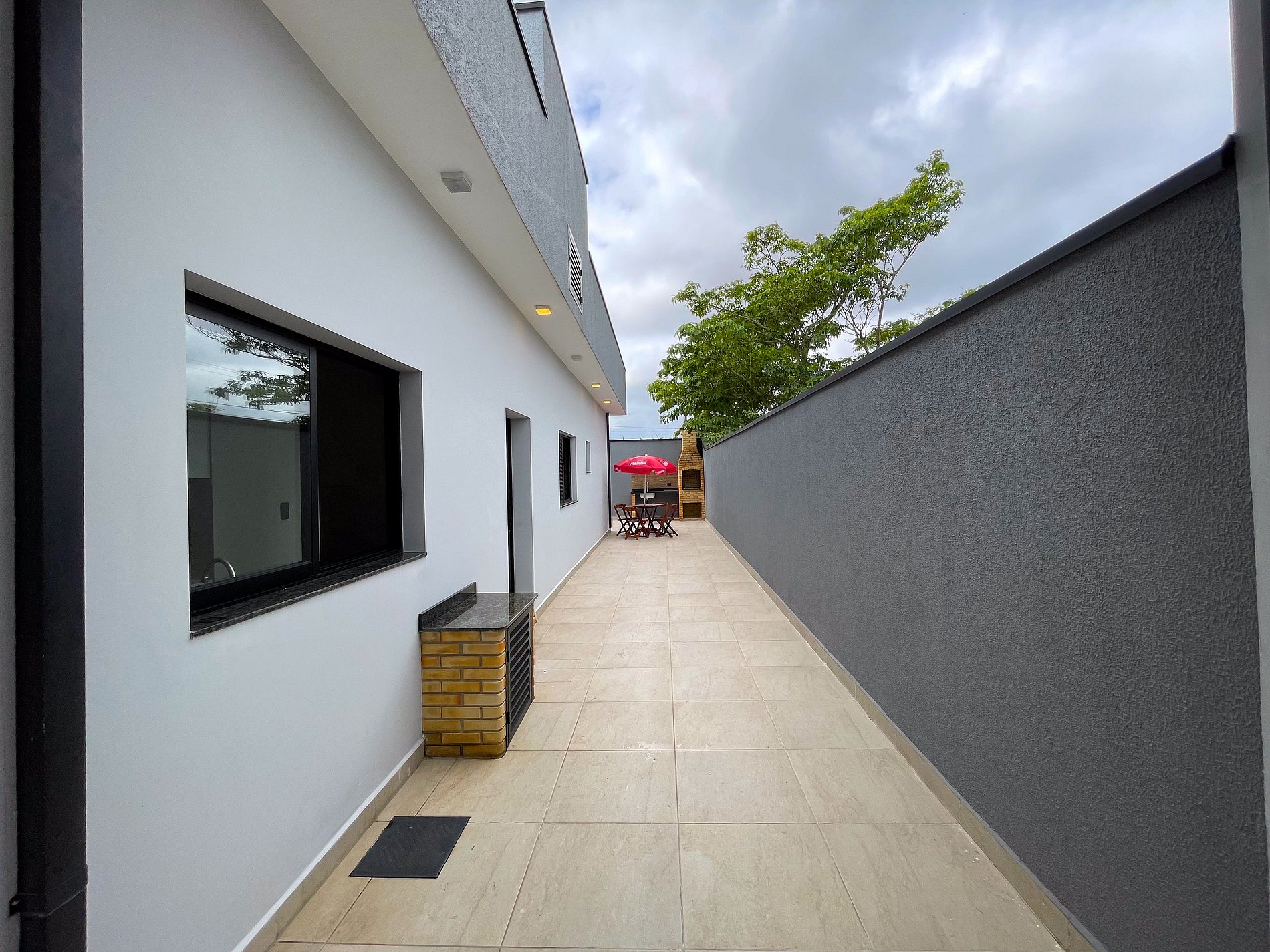 A área externa é um grande destaque, com piscina e espaço para churrasqueira, perfeita para relaxar após um dia de praia.