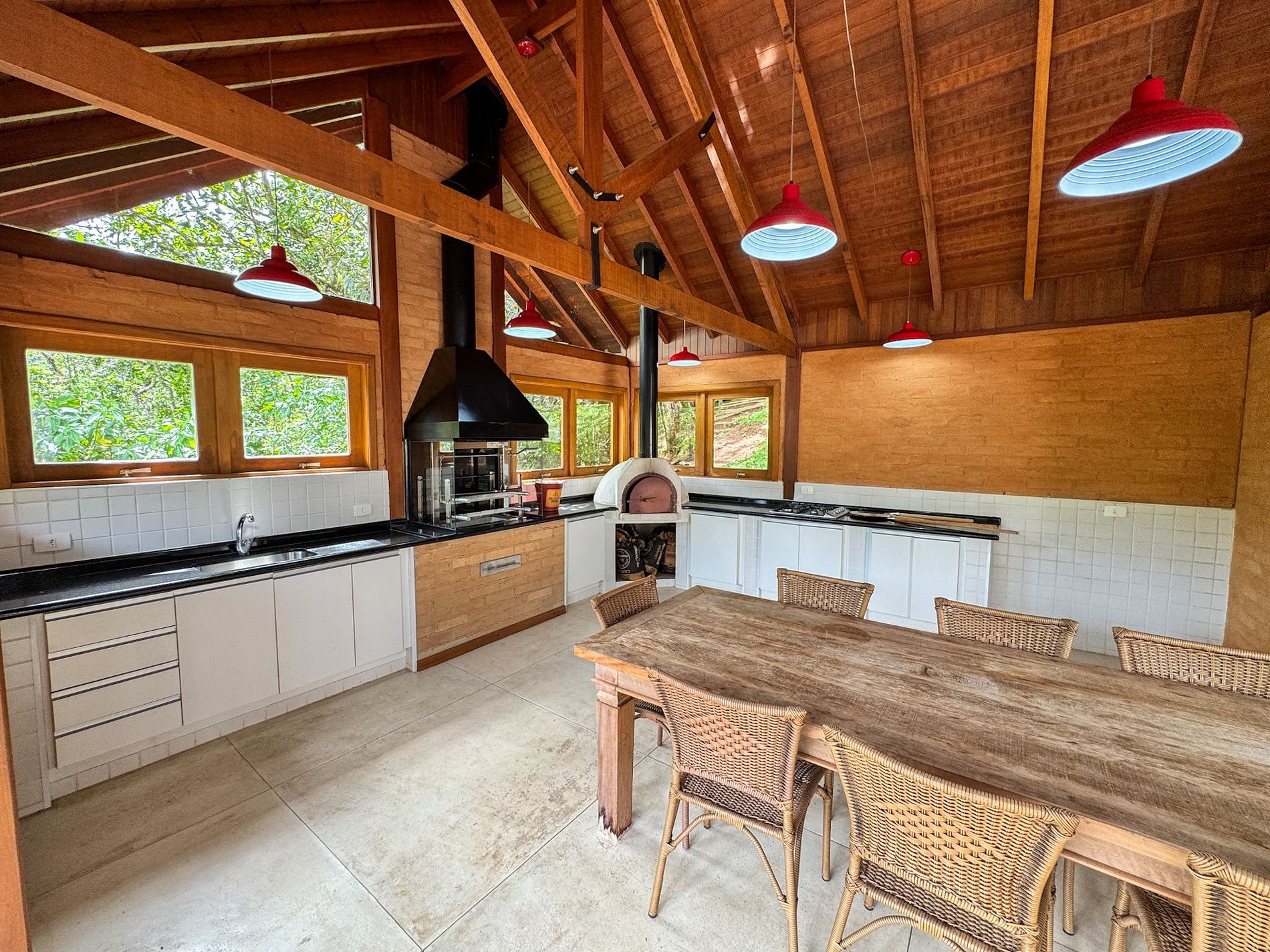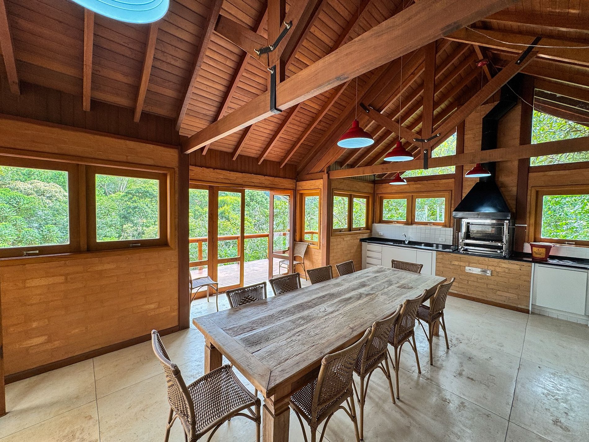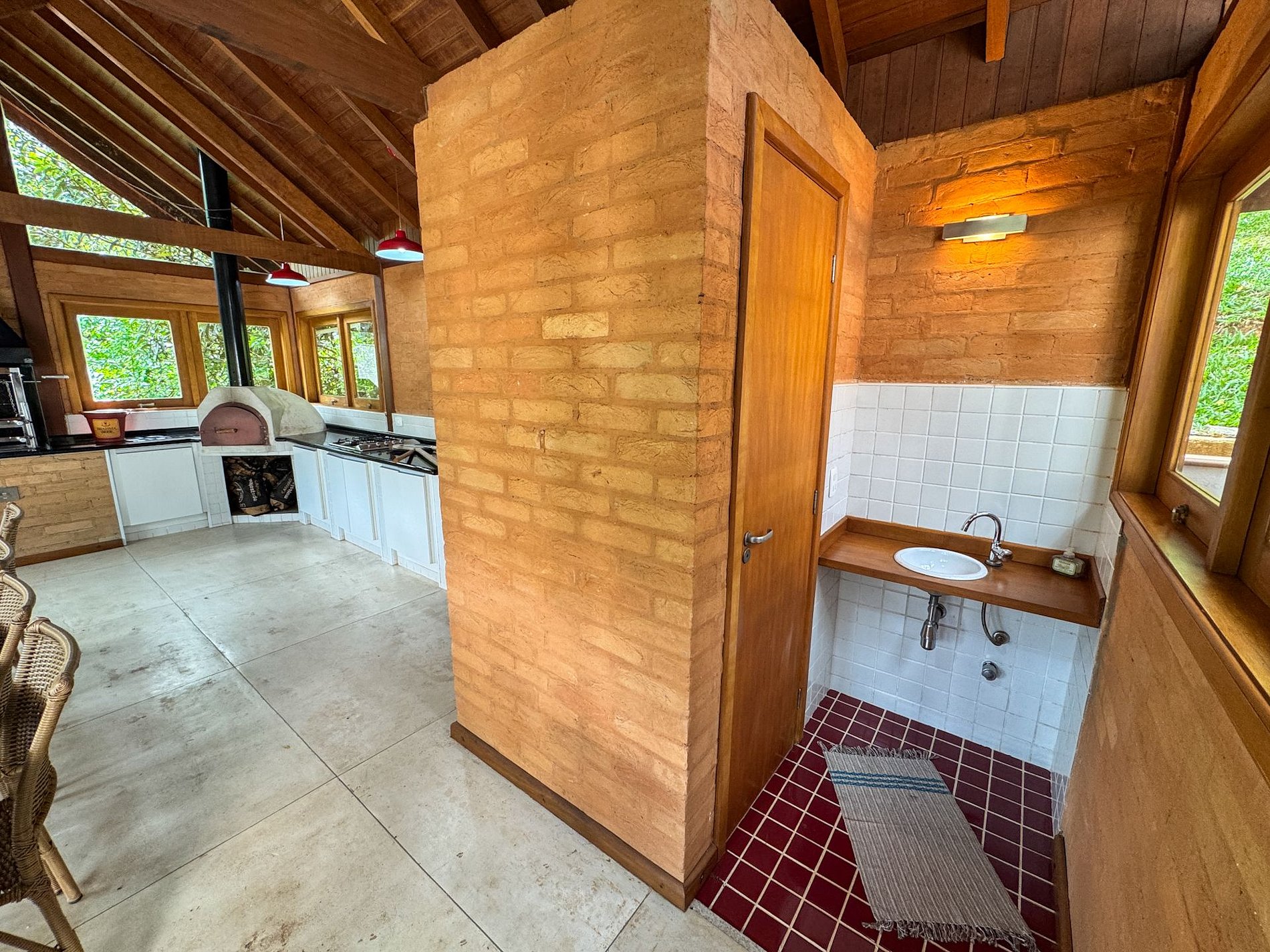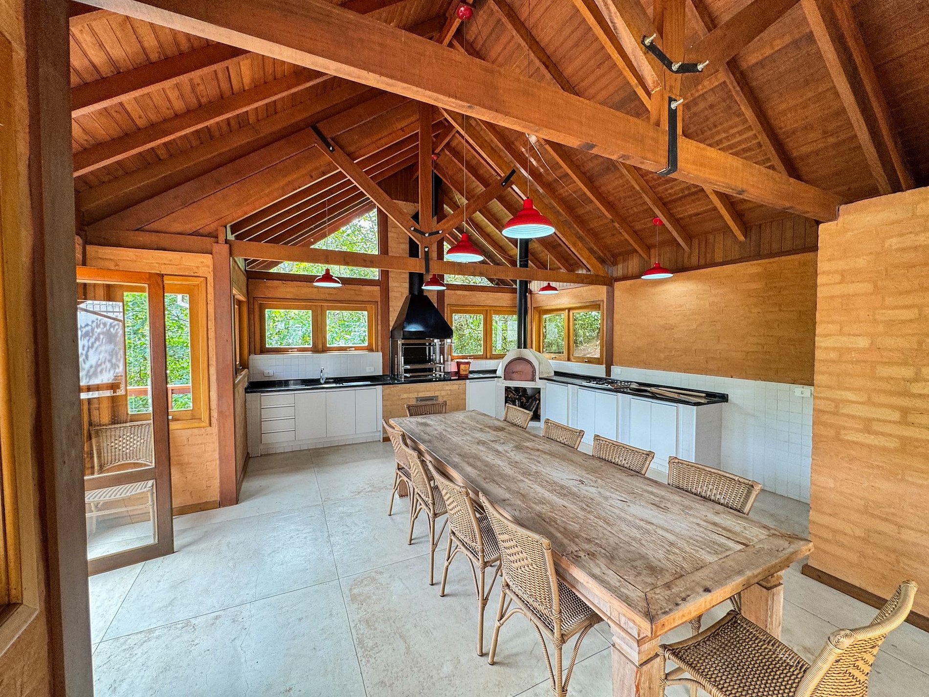 Na área externa da casa, o destaque é o amplo jardim em meio ao verde, onde está localizada a horta orgânica da própria residência. O espaço também conta com churrasqueira privativa e ambientes ideais para relaxar ao ar livre.