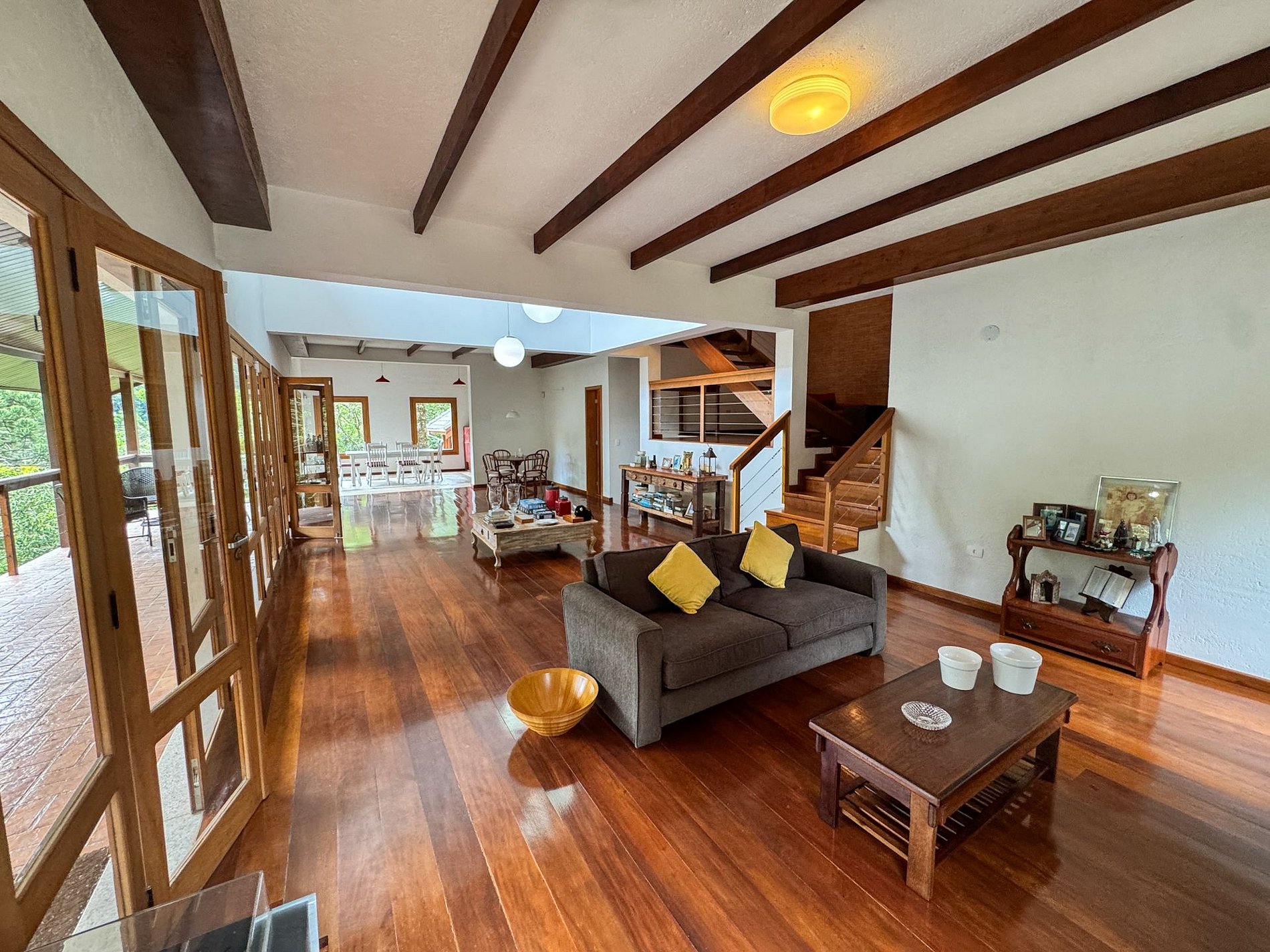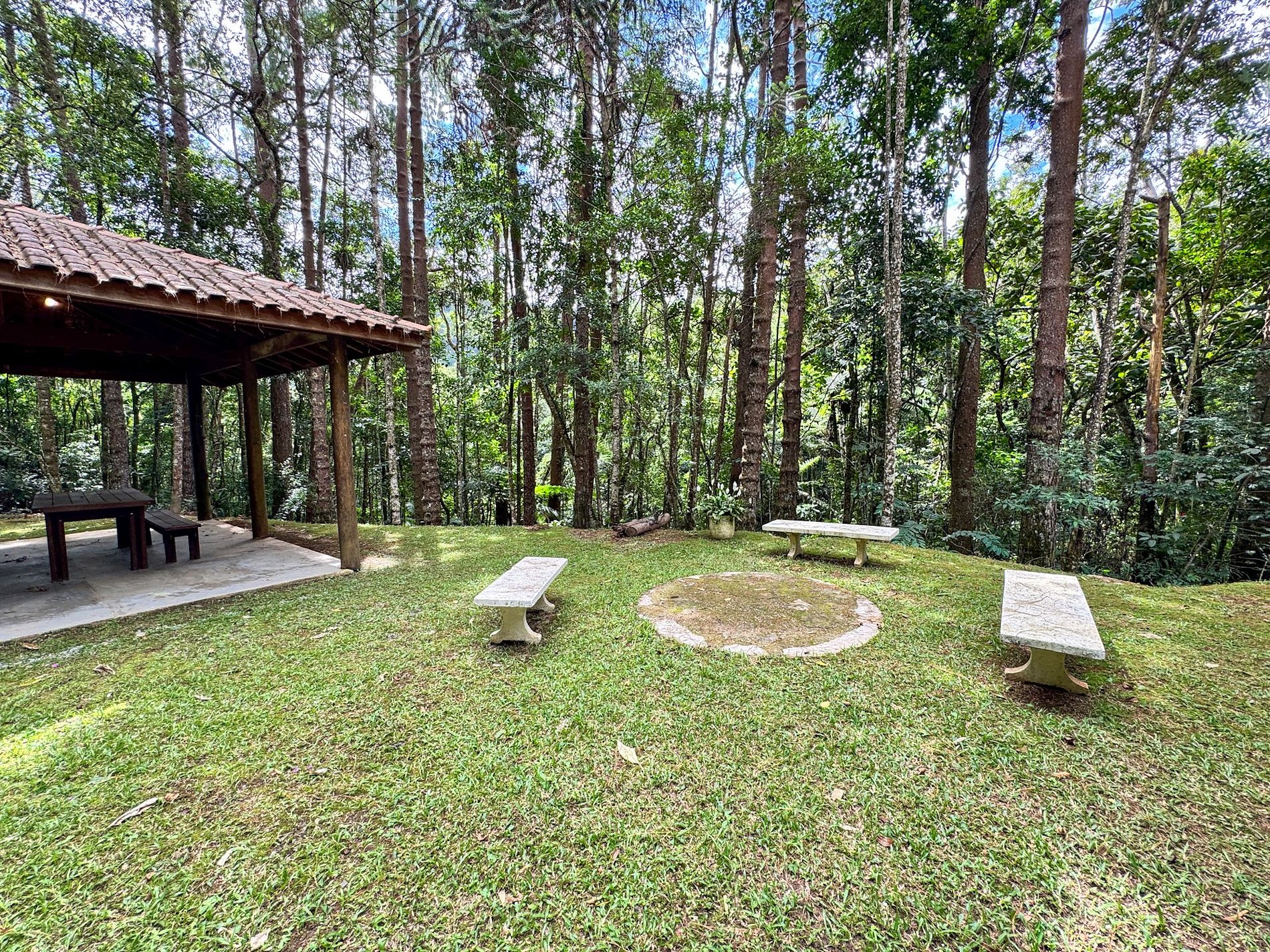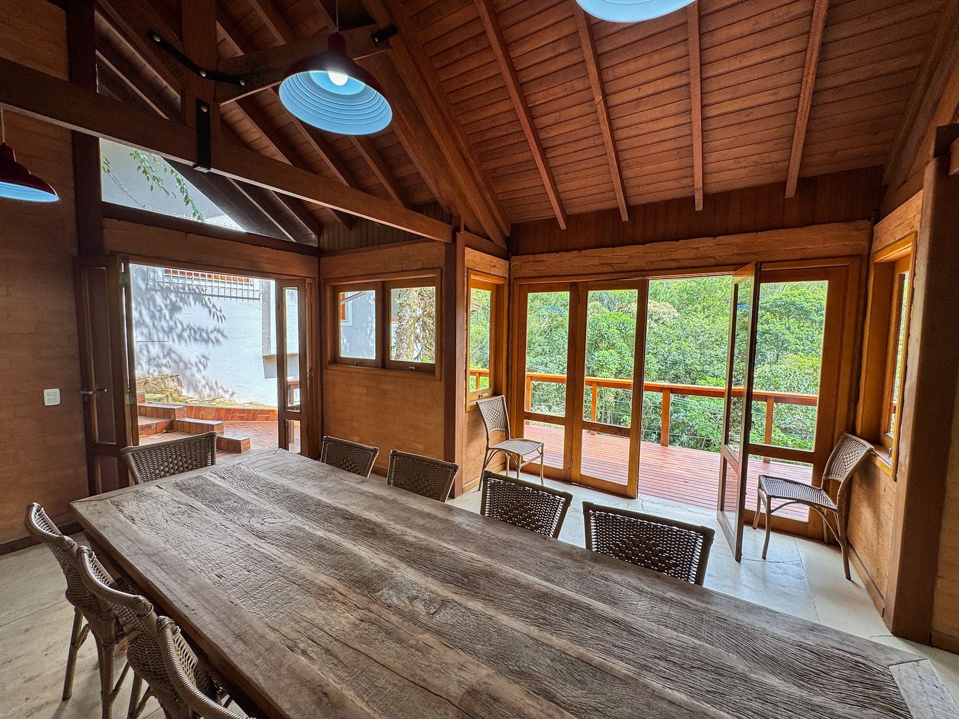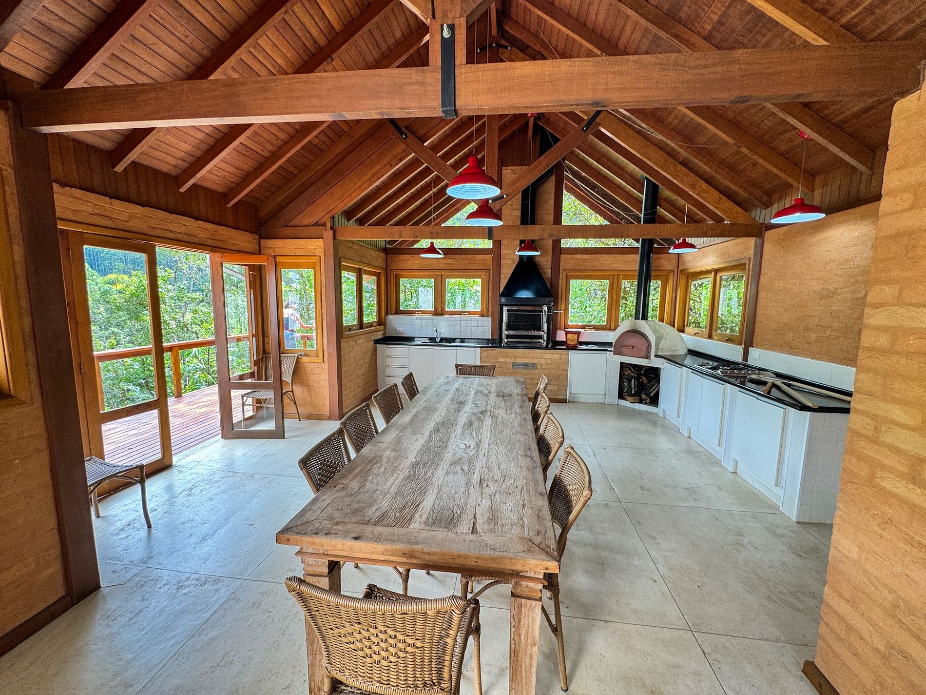Na área externa da casa, o destaque é o amplo jardim em meio ao verde, onde está localizada a horta orgânica da própria residência. O espaço também conta com churrasqueira privativa e ambientes ideais para relaxar ao ar livre.