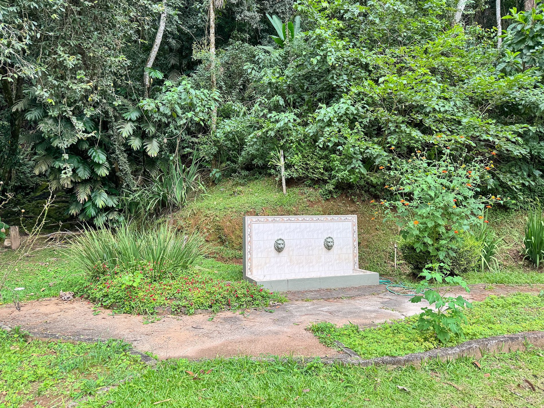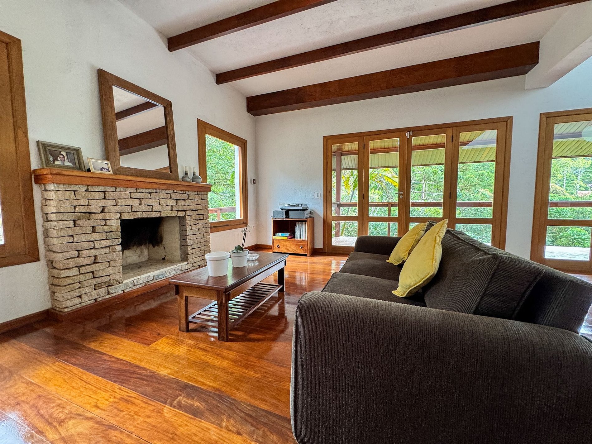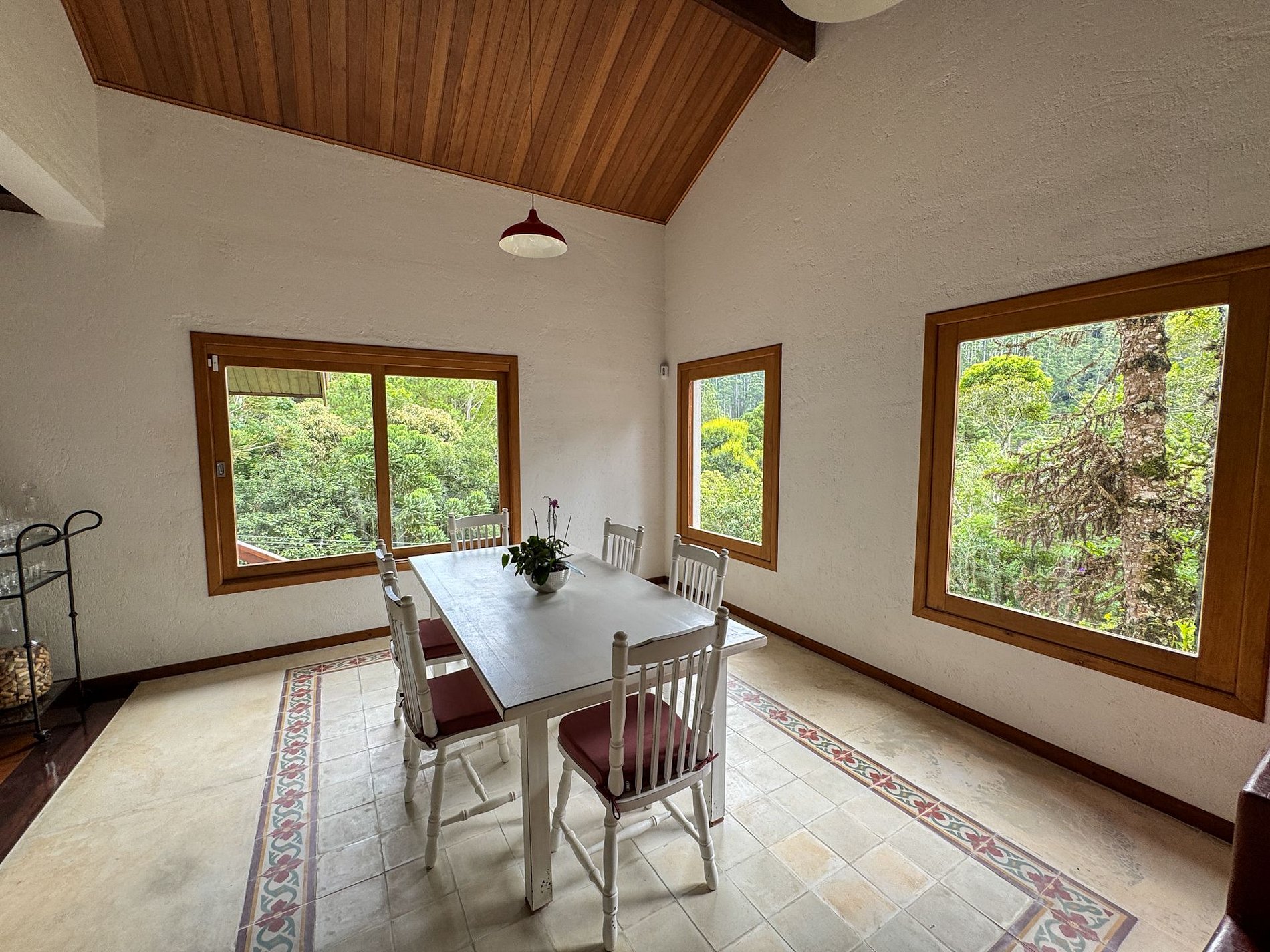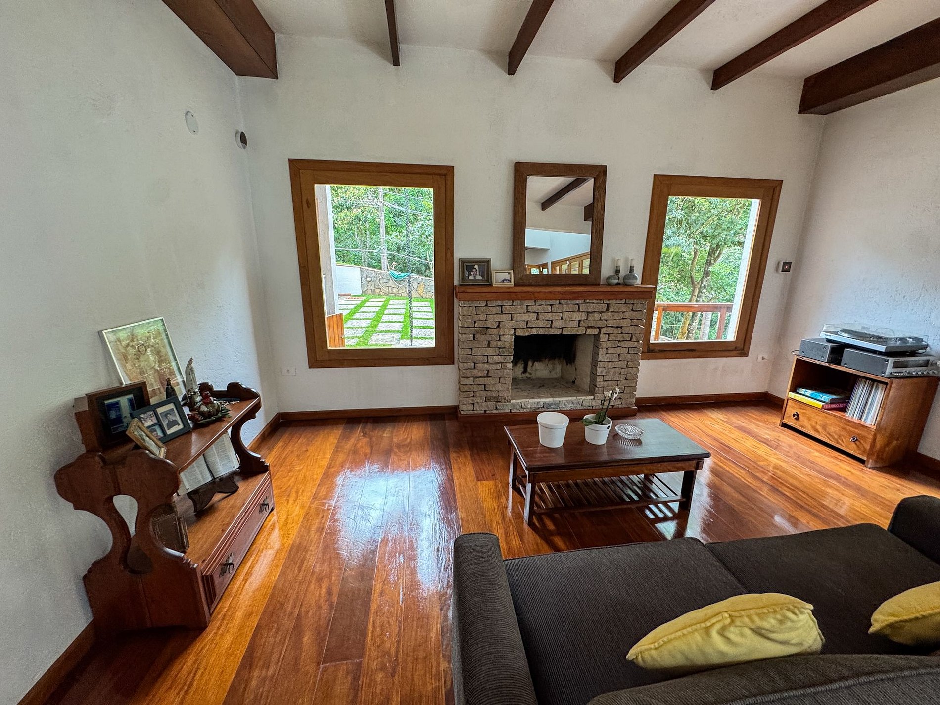 Na área externa da casa, o destaque é o amplo jardim em meio ao verde, onde está localizada a horta orgânica da própria residência. O espaço também conta com churrasqueira privativa e ambientes ideais para relaxar ao ar livre.