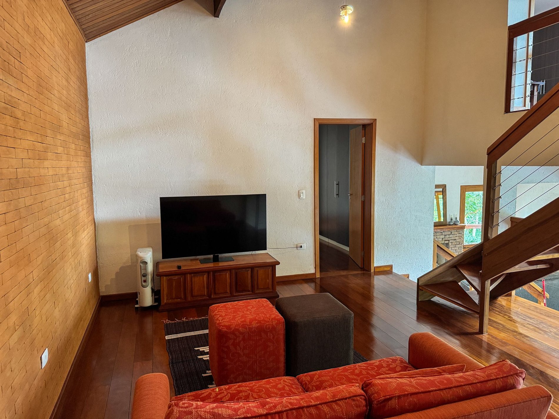 Dispomos de uma sala aconchegante com lareira, perfeita para os dias frios, além de espaço para refeições e fogão a lenha, proporcionando uma experiência acolhedora e especial.