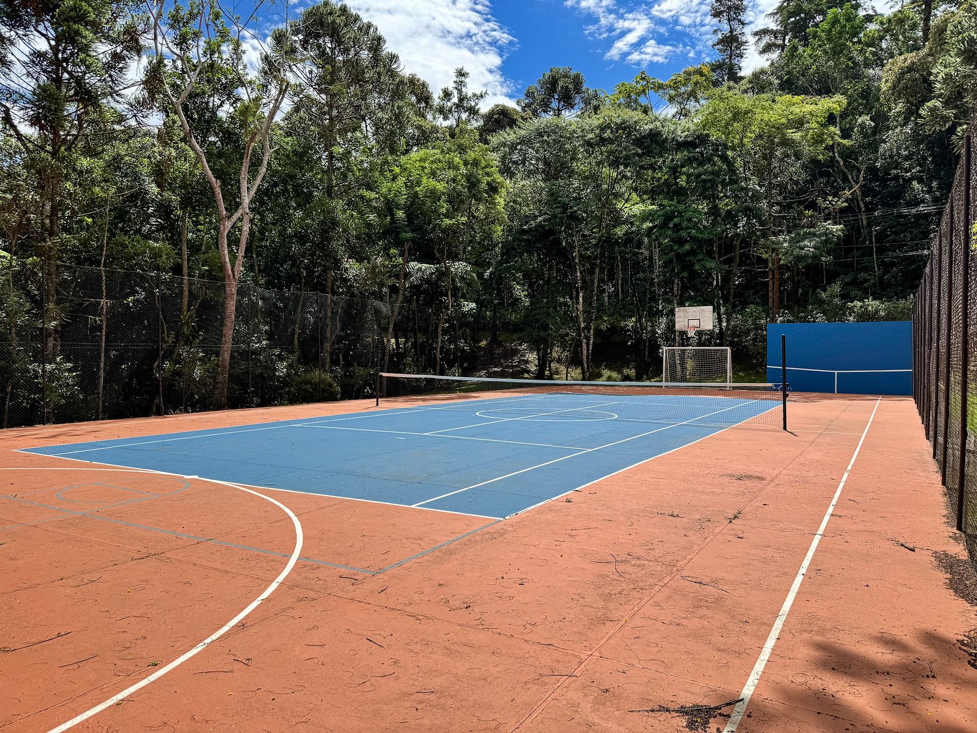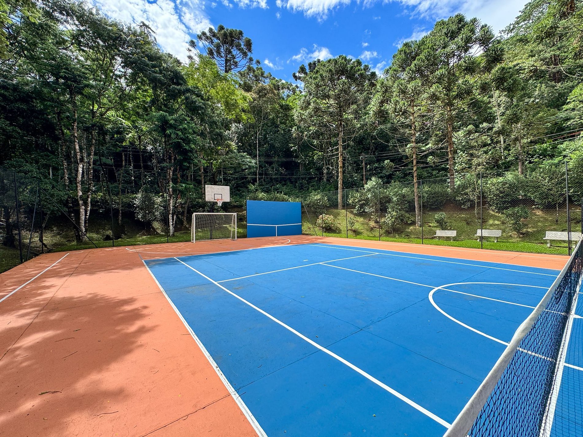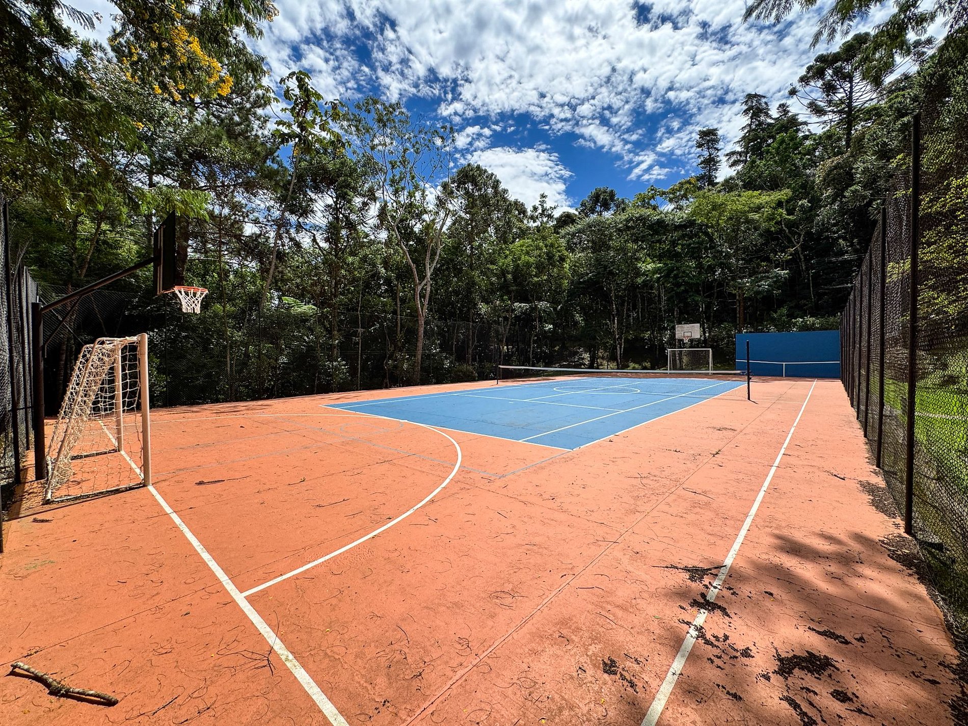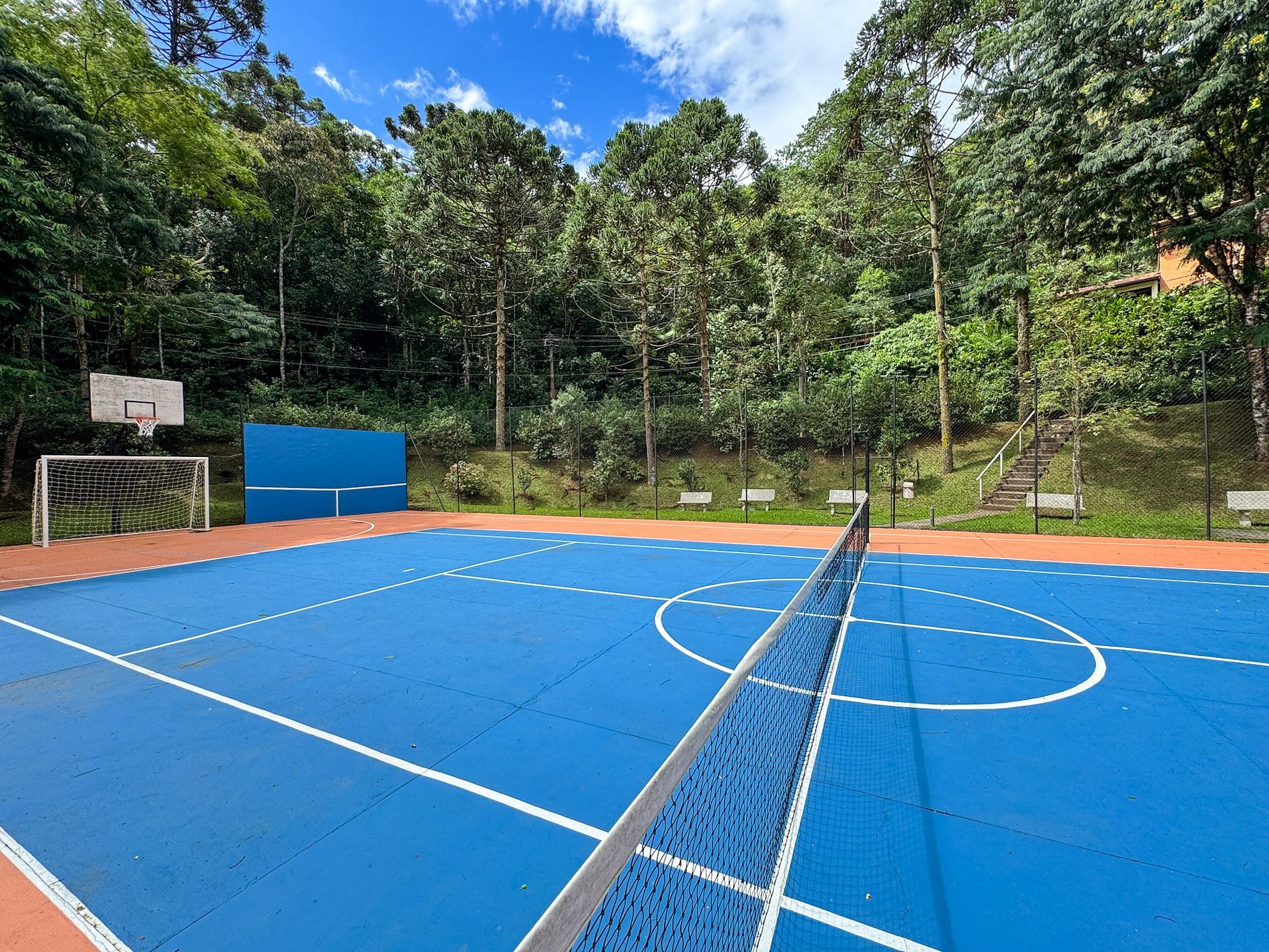 Nas áreas comuns do condomínio, os hóspedes têm acesso a parquinho infantil, quadra poliesportiva e uma charmosa mini cachoeira, perfeita para momentos de descanso e contato com a natureza.
