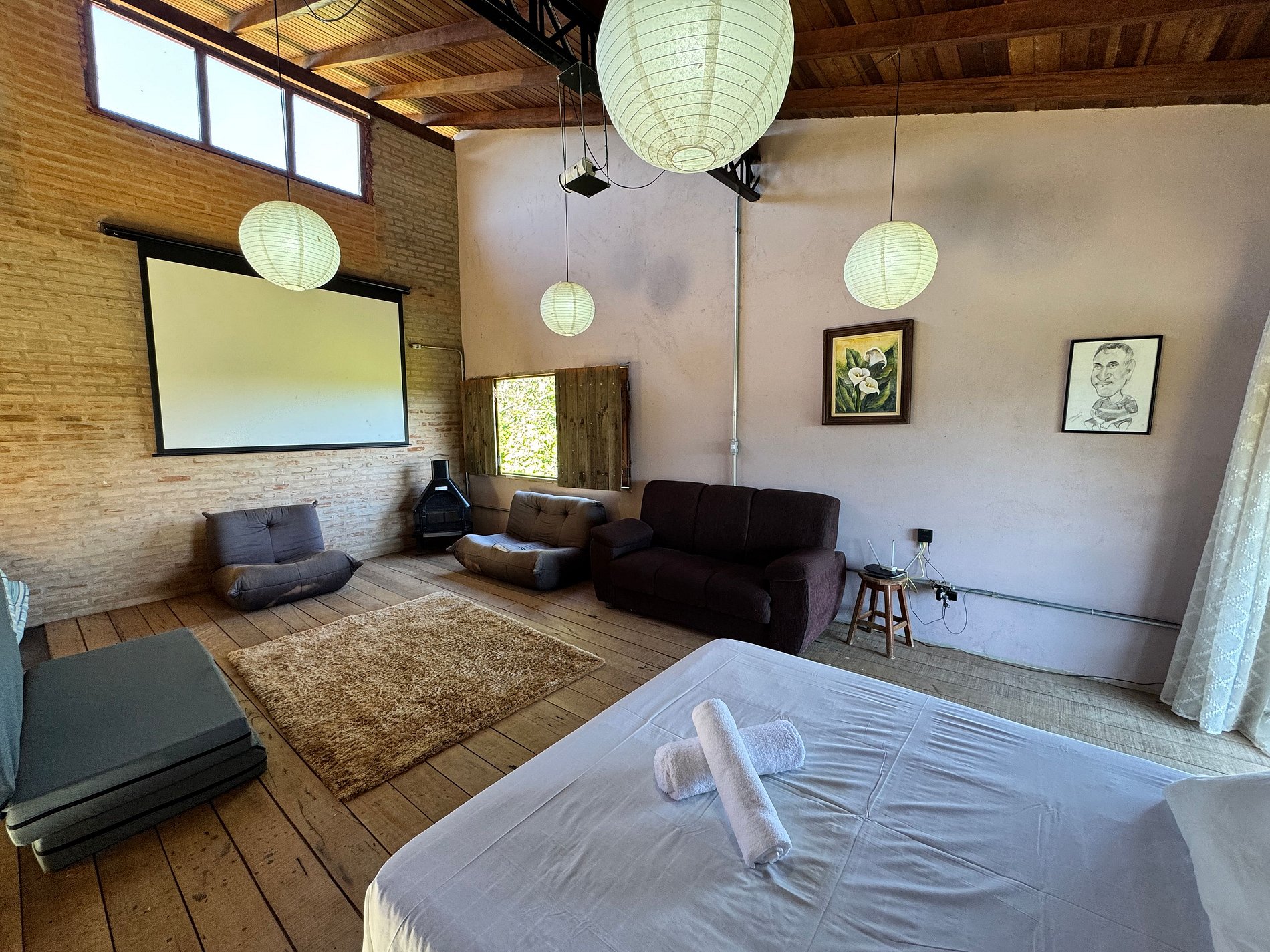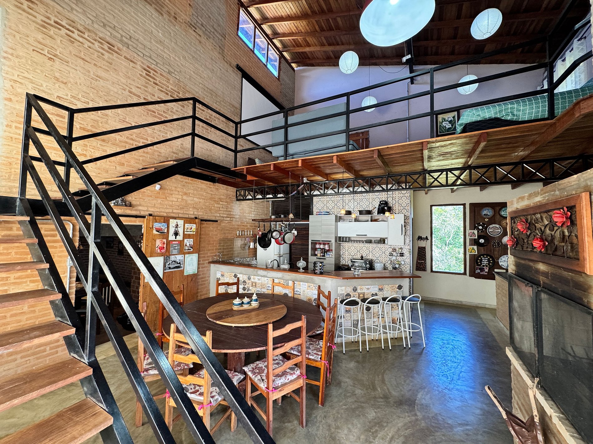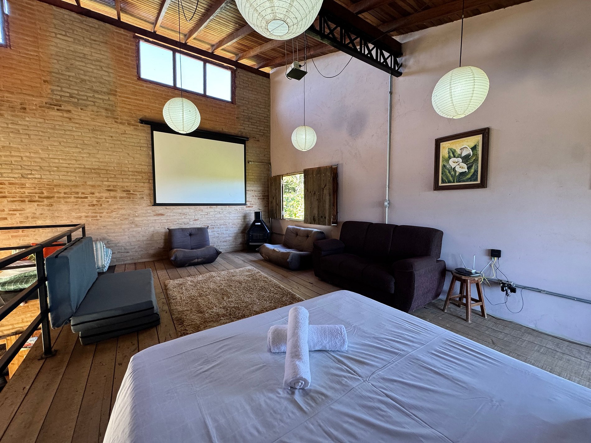O espaço conta com 2 suítes confortáveis e 1 quarto integrado à sala, acomodando bem casais e famílias. Dispõe de uma sala de TV aconchegante e uma cozinha americana equipada, perfeita para momentos em conjunto.