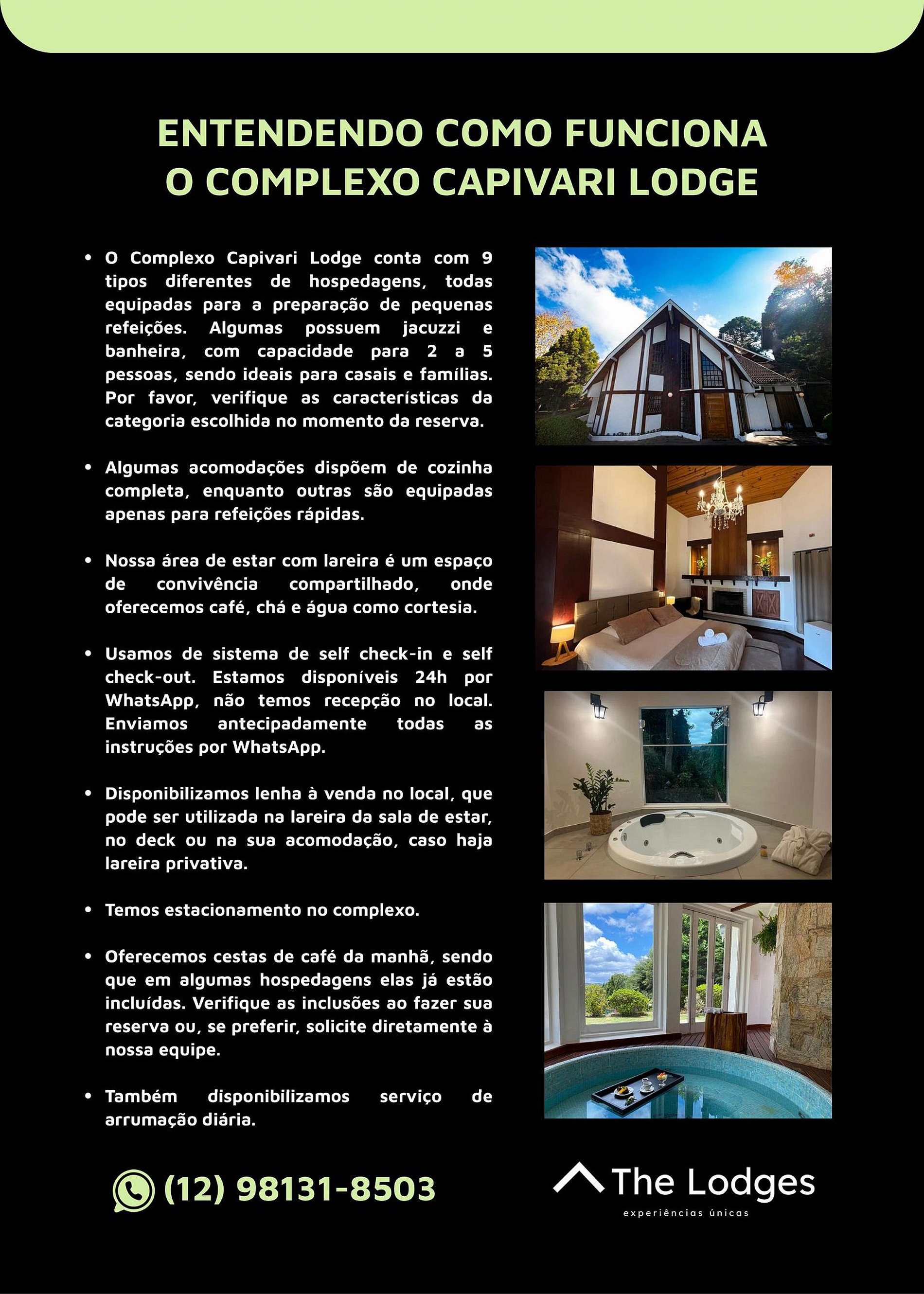 É um imenso prazer recebe-los no Capivari Lodge. Cuidamos de tudo nos menores detalhes para garantir que tenha uma experiência memorável conosco. Nós queremos cuidar de você e por isso temos serviços “on demand” como café da manhã, massagem, fondue entre outros. Venha desfrutar de acomodações confortáveis e a mais bela vista da região. Estamos à disposição durante toda sua estadia, iremos recebe-los no check in e check out e disponível por whatsapp sempre que precisar.