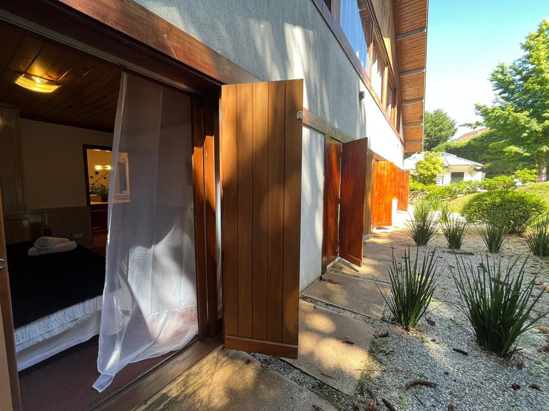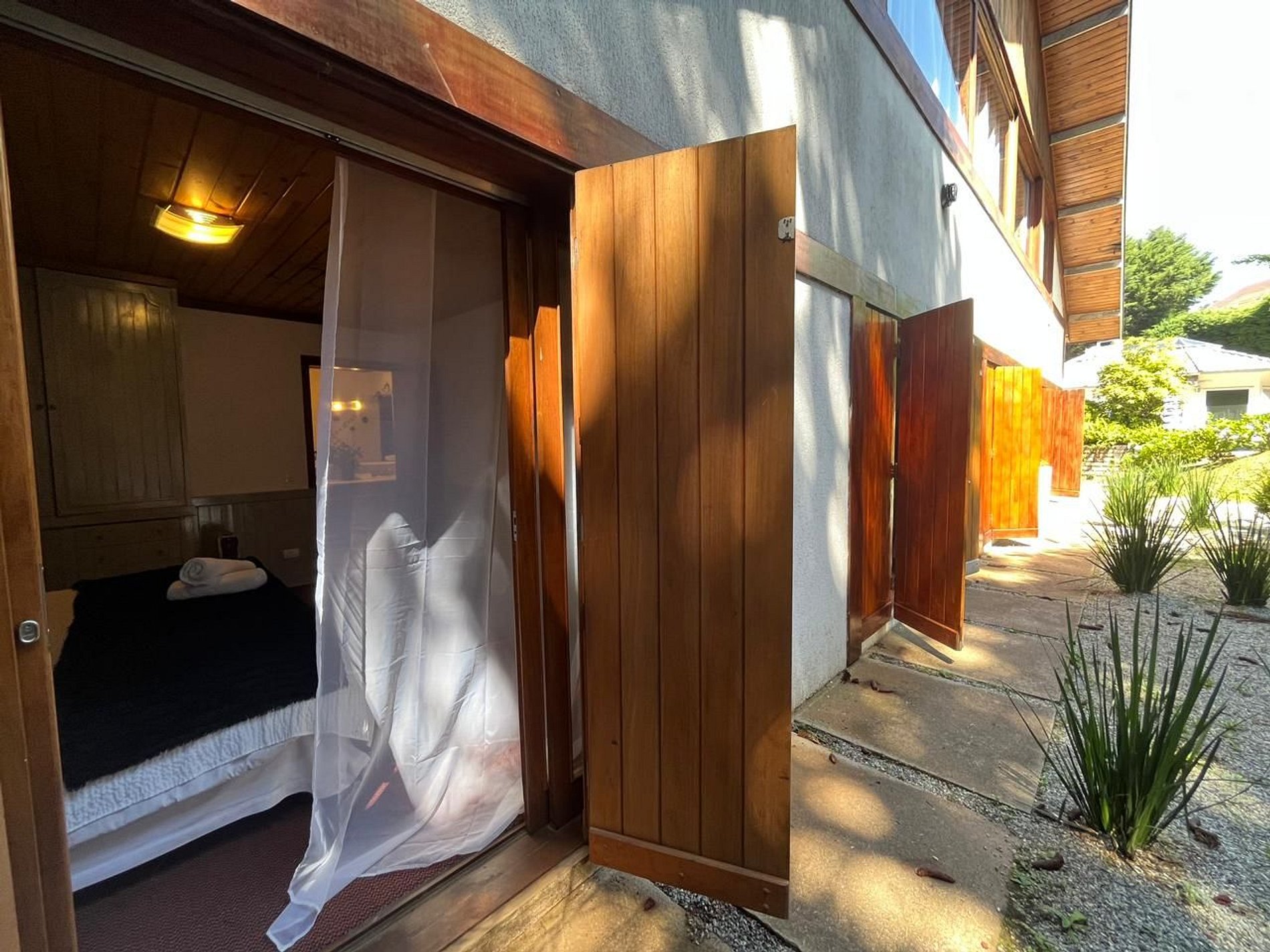 Quarto conjugado espaçoso e confortável com acesso para nosso jardim, ideal para receber sua família. Equipado com TV smart e frigobar. O quarto é composto por uma cama de casal e uma cama de solteiro, e, no outro quarto com uma cama de casal.
