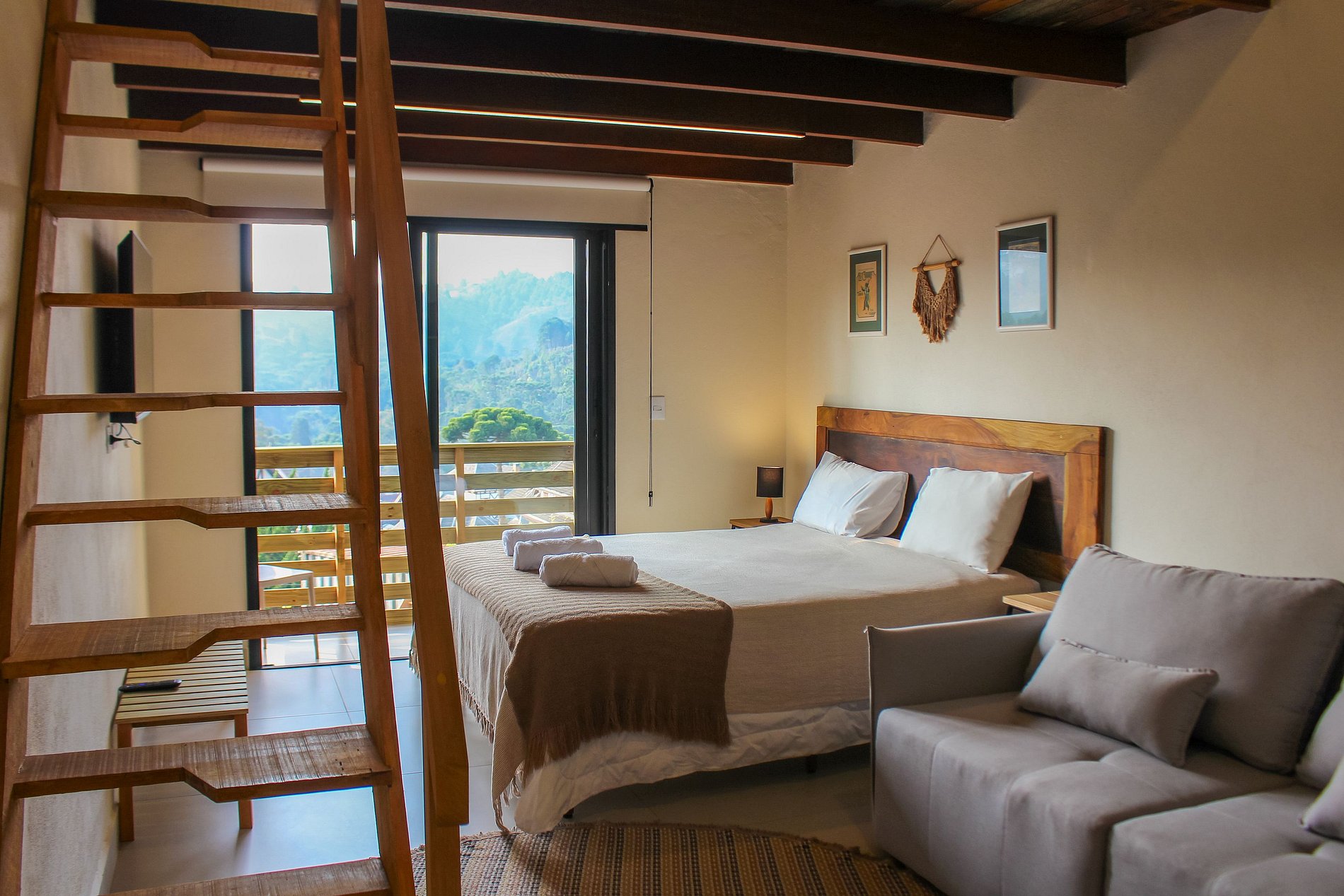 Nosso estúdio novo e moderno está localizado no coração do centro turístico do Capivari, composto por 1 suíte e 1 quarto suspenso com 1 cama de casal em cada para casais e famílias. Contamos com uma pequena sala de estar e cozinha equipada. Disponibilizamos roupa de cama e banho completo. Temos estacionamento cortesia no local. Disponibilizamos de internet wi-fi e possuímos TV smart. Contamos também com uma sala de estar de uso comum com lareira e jogos.