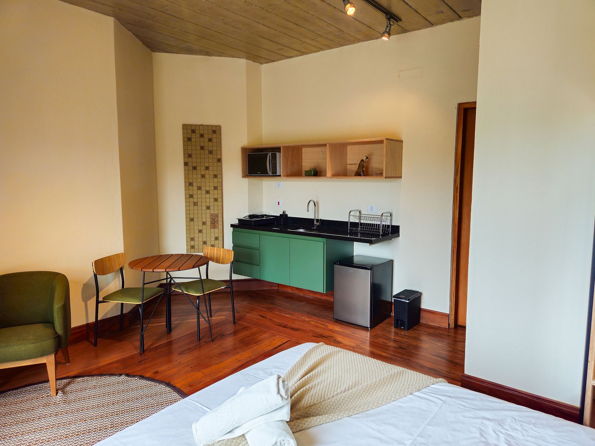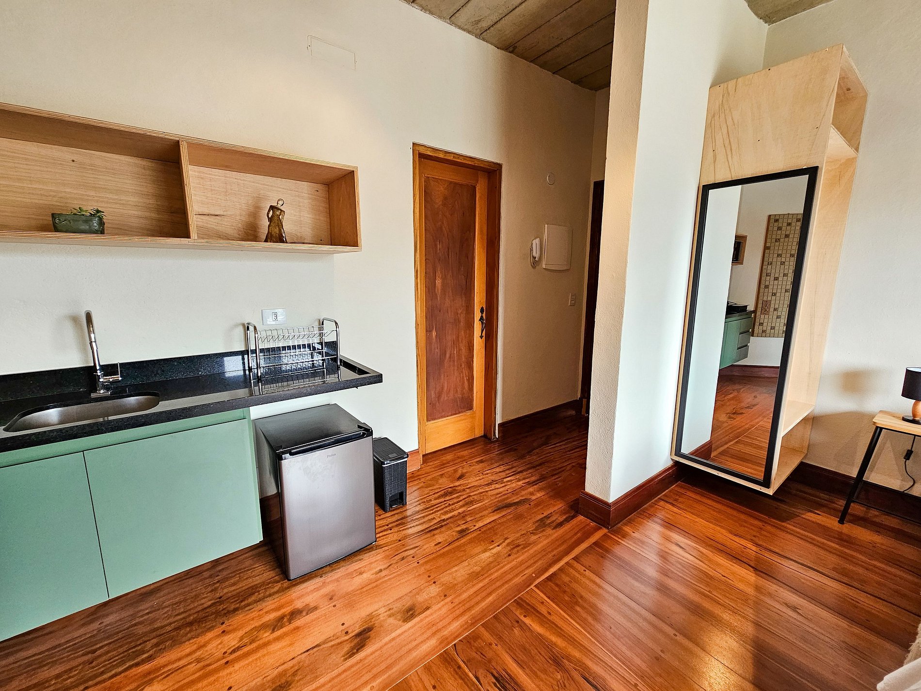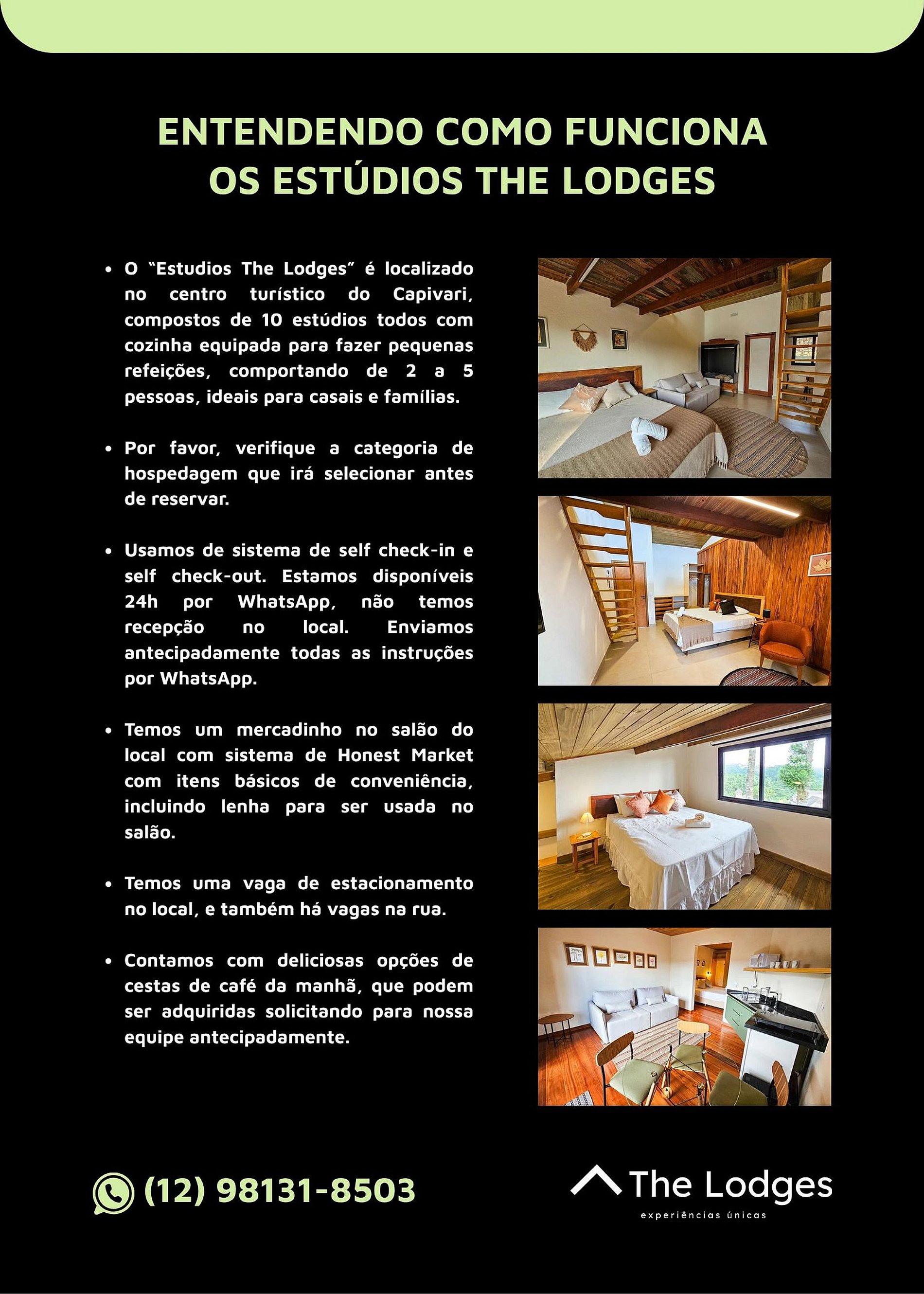 Nosso estúdio novo e moderno está localizado no coração do centro turístico do Capivari, composto por 1 suíte com um sofá cama para casais e famílias. Contamos com uma pequena sala de estar e cozinha equipada. Disponibilizamos roupa de cama e banho completo. Temos estacionamento cortesia no local. Disponibilizamos de internet wi-fi e possuímos TV smart. Contamos também com uma sala de estar de uso comum com lareira e jogos.