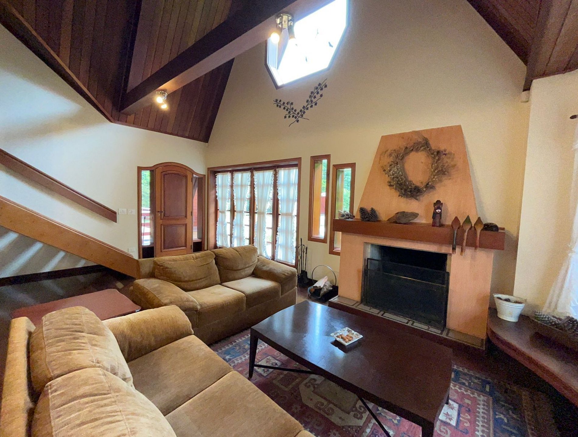 Temos uma cozinha completa, sala de estar com lareira e mesa de jogos, sala de jantar , sala de TV com claraboia e na parte externa do imóvel temos um gazebo para descanso e linda vista para o jardim, área gourmet com fogão, forno de pizza a lenha, churrasqueira e lavabo e um super aconchegante redário.