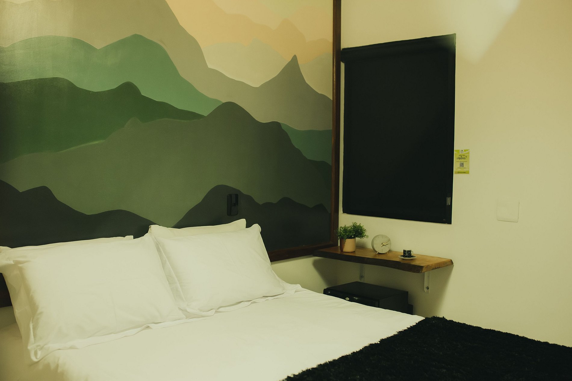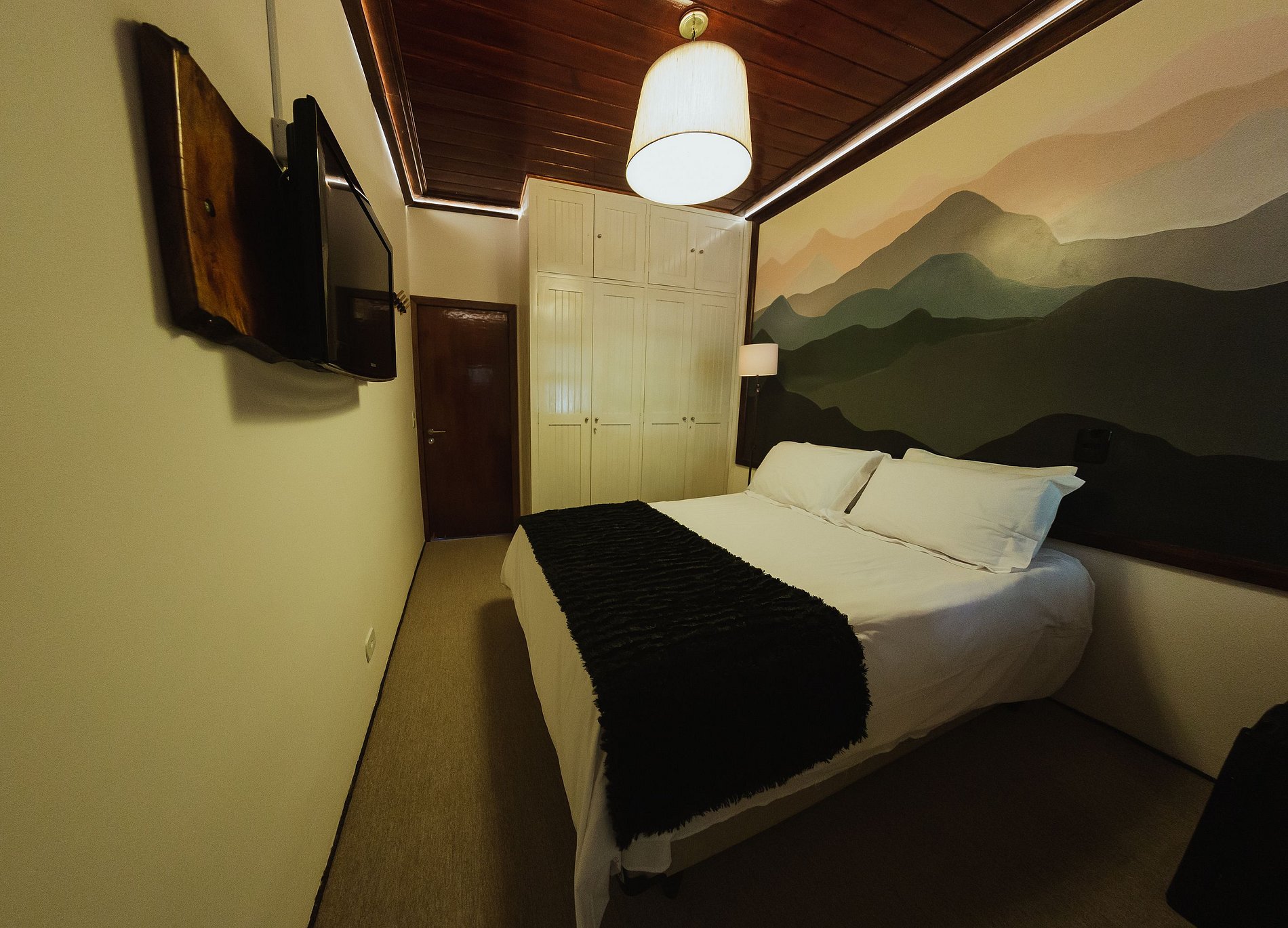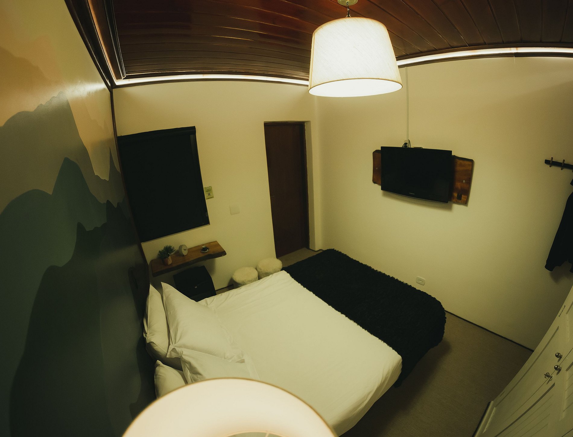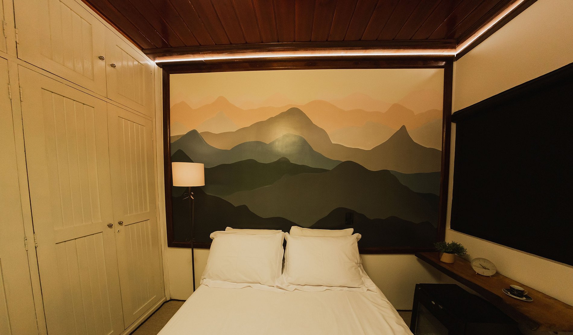 Quarto aconchegante ideal para casal. A acomodação é equipada com TV smart e frigobar, suíte composta por uma cama de casal. A suite está localizada no salão da recepção em baixo da escada do complexo.