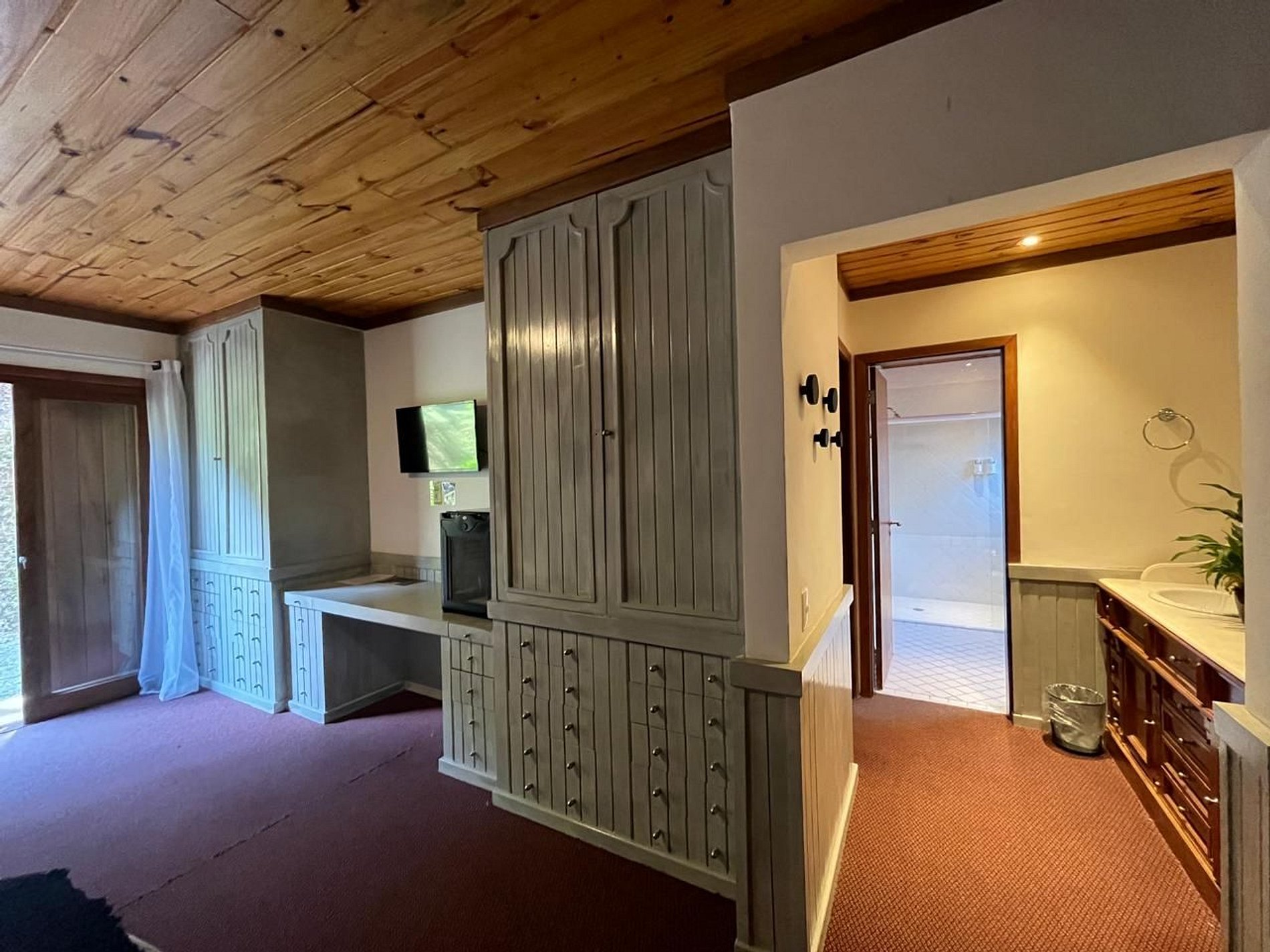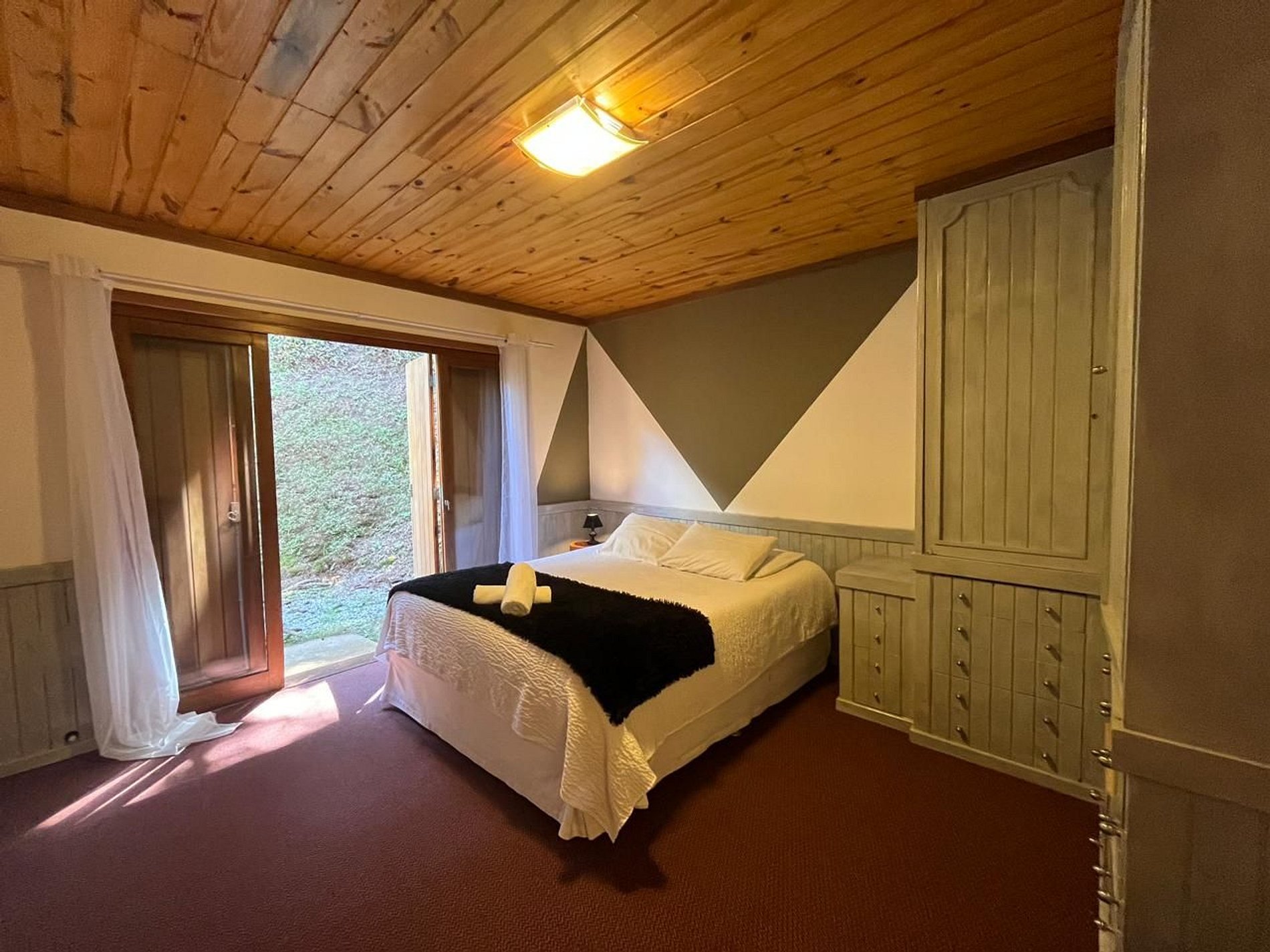 Este quarto é uma das acomodações que compõe a Pousada Capivari Lodge, no bairro Alto Capivari.