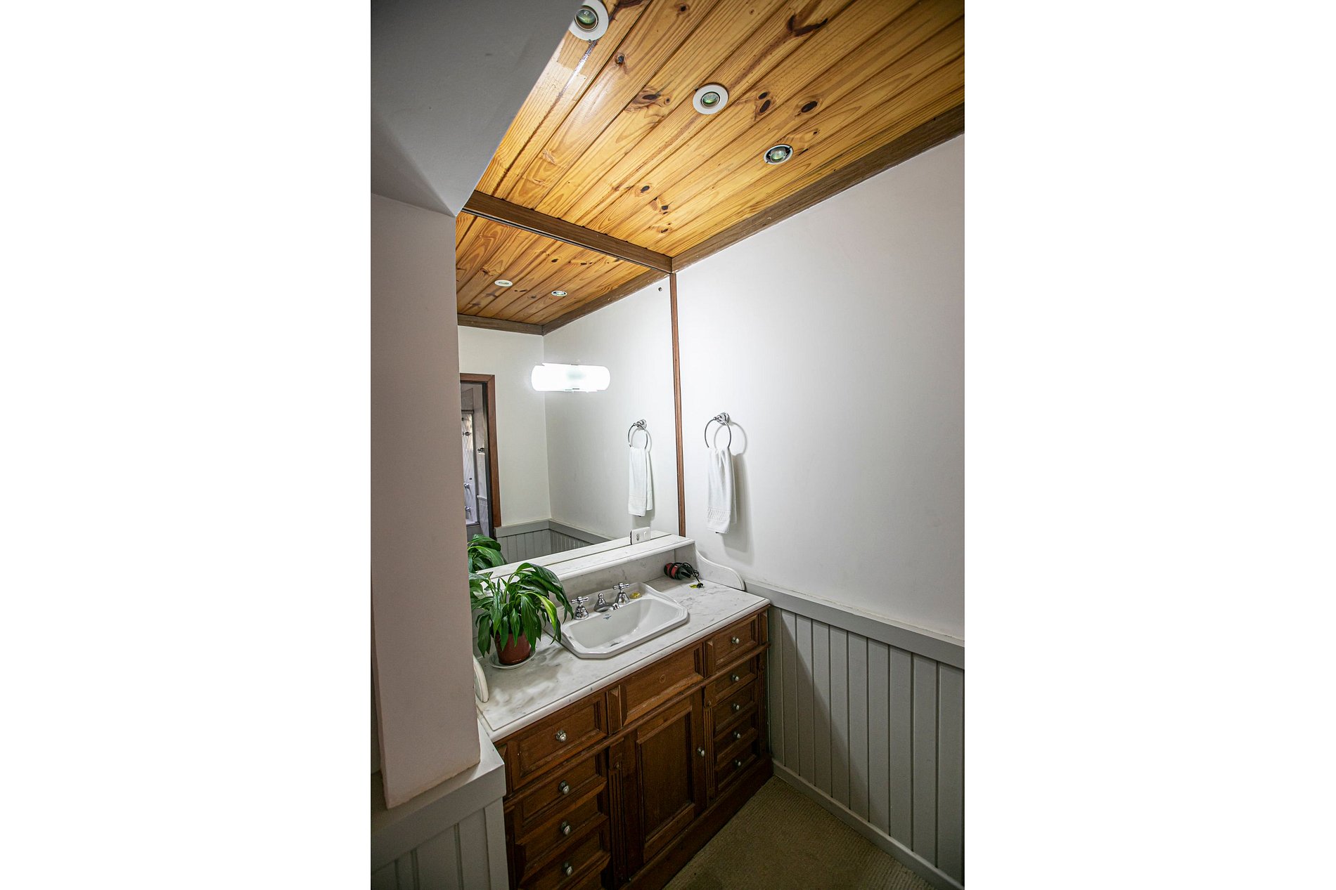 Carpete antigo, ausência de um restaurante no local.