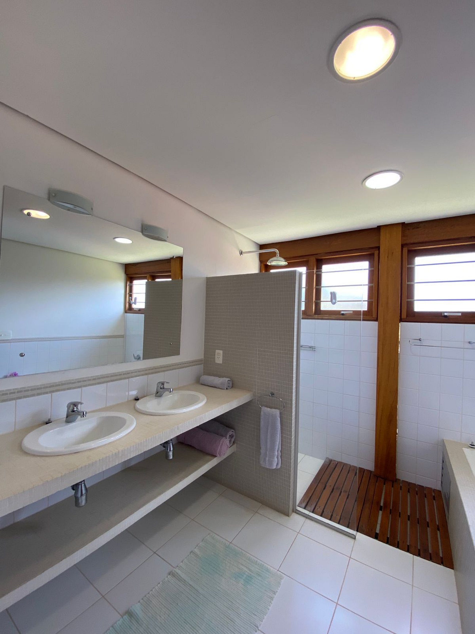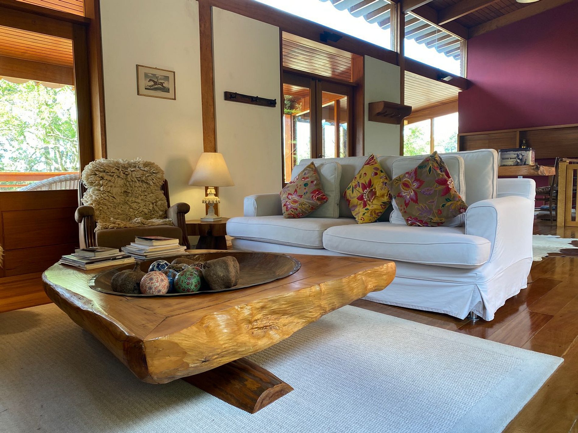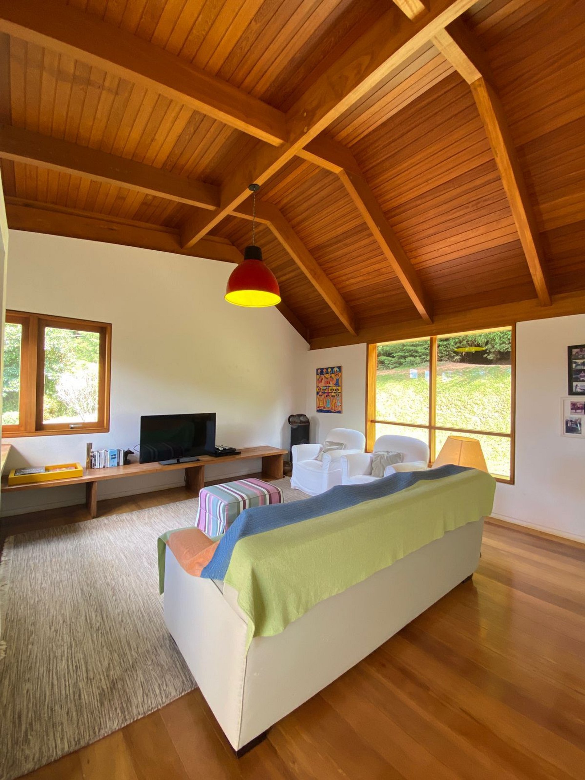A casa possui todas as vigas e pilares da madeira Pequiá que vieram de áreas de manejo da região da Amazônia, as paredes feitas com tijolos duplos para isolamento térmico e bastante vidro, como a casa eh face norte recebe muita insolação que mantém o calor interno
