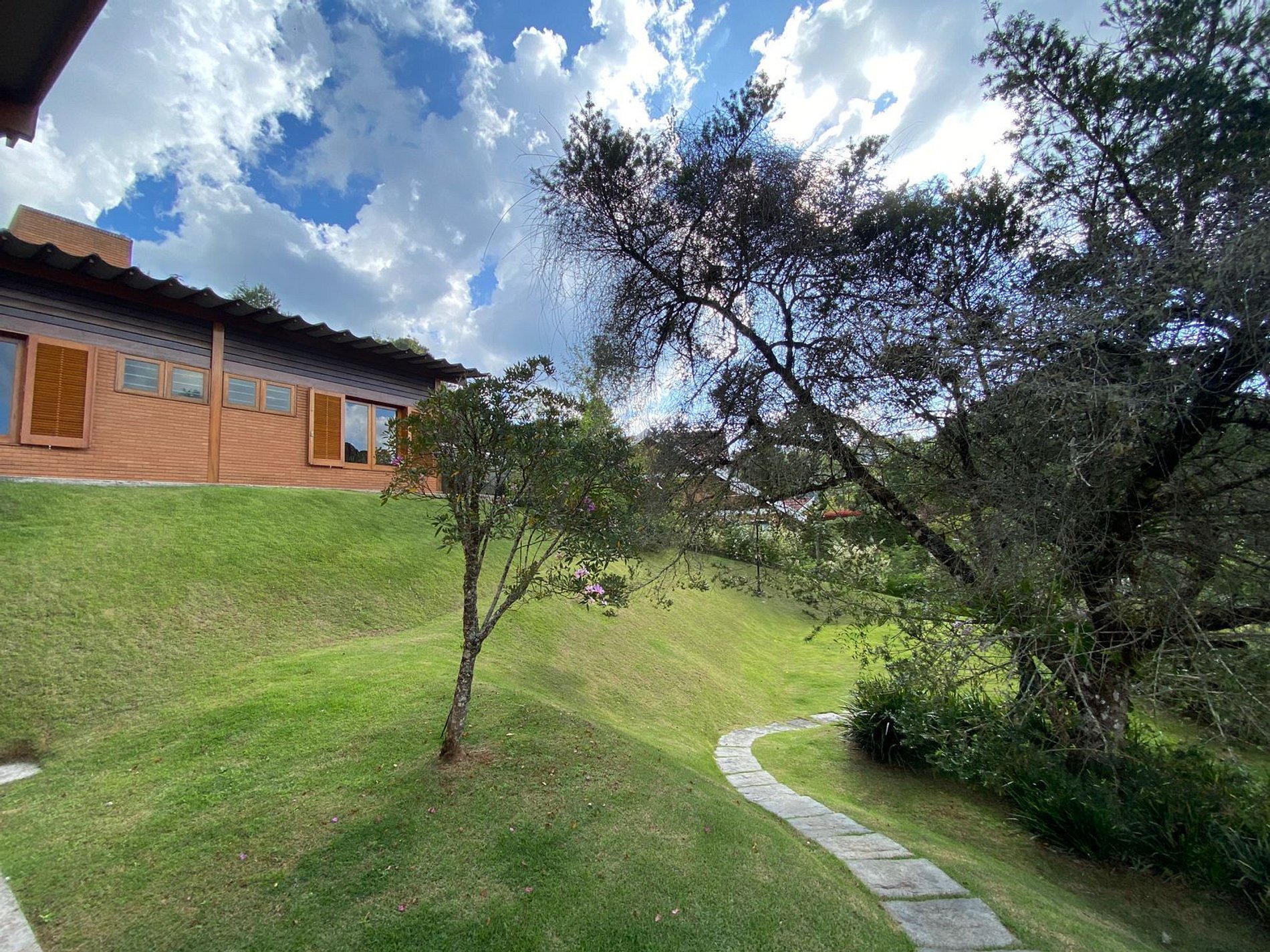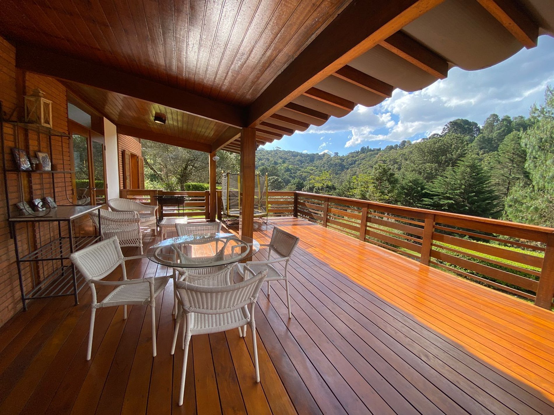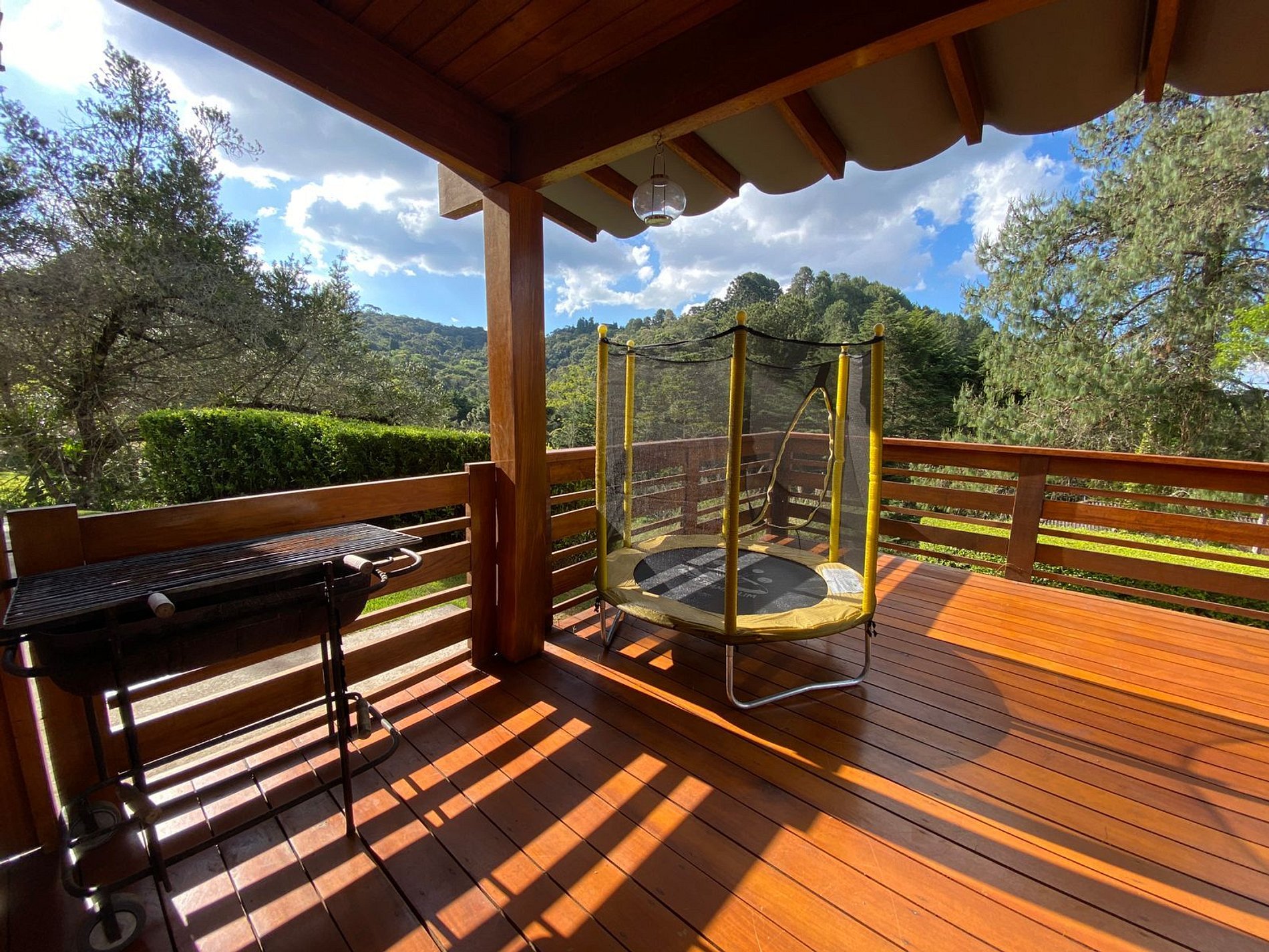 Belo jardim, deck espaçoso com churrasqueira e pula-pula para crianças e com vista para uma belíssima paisagem verde.