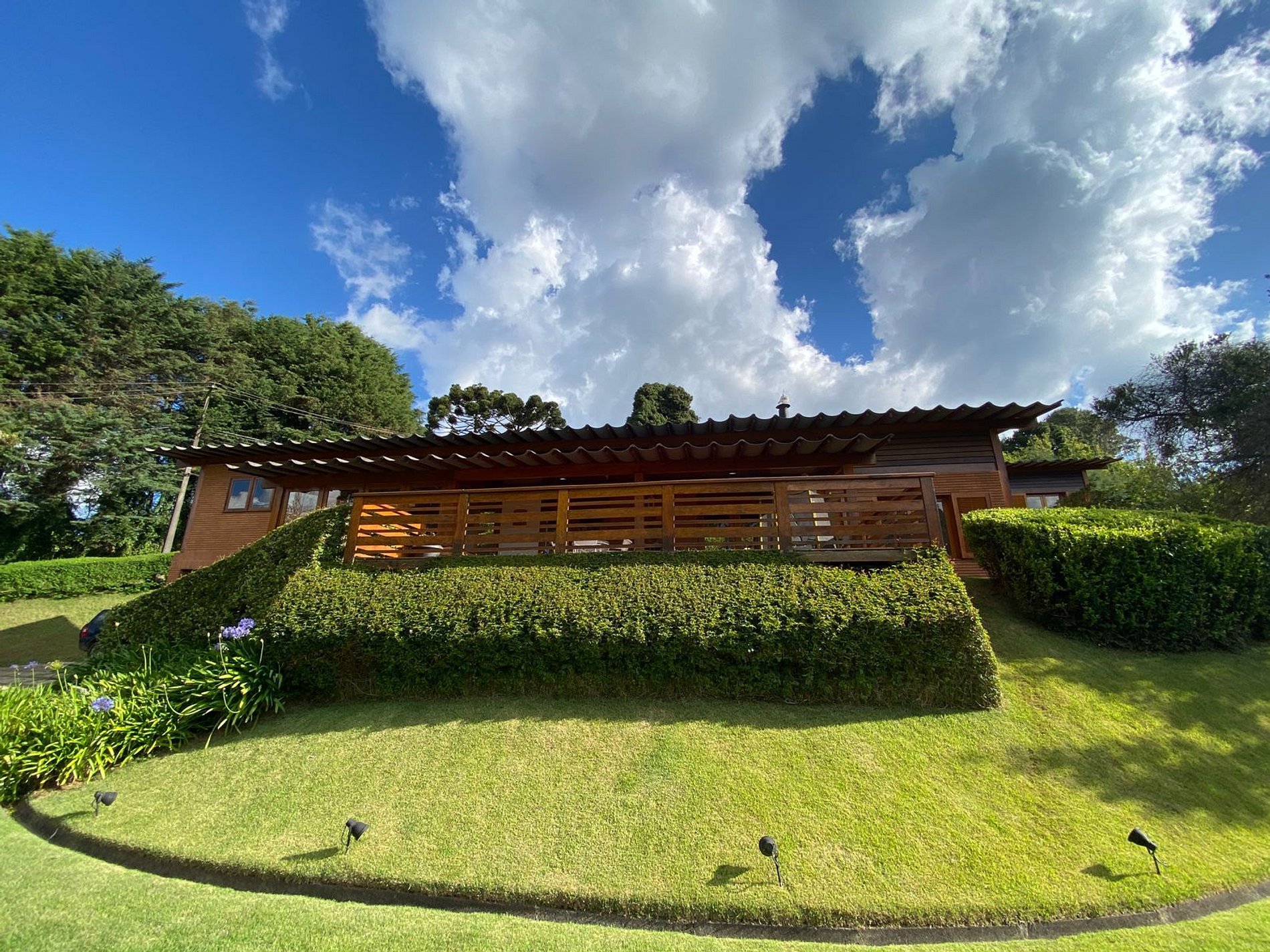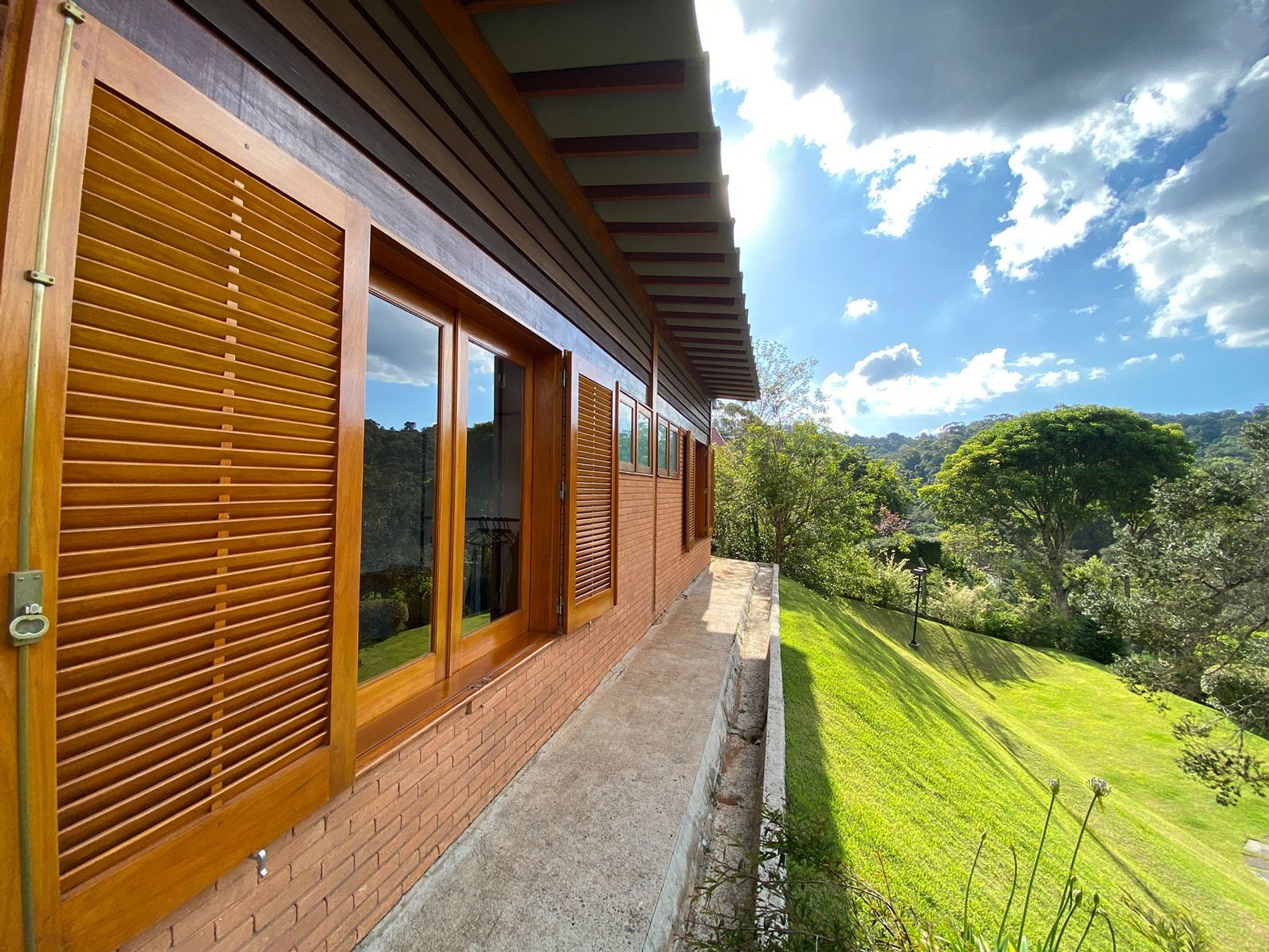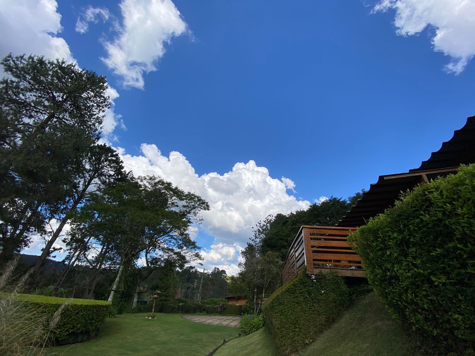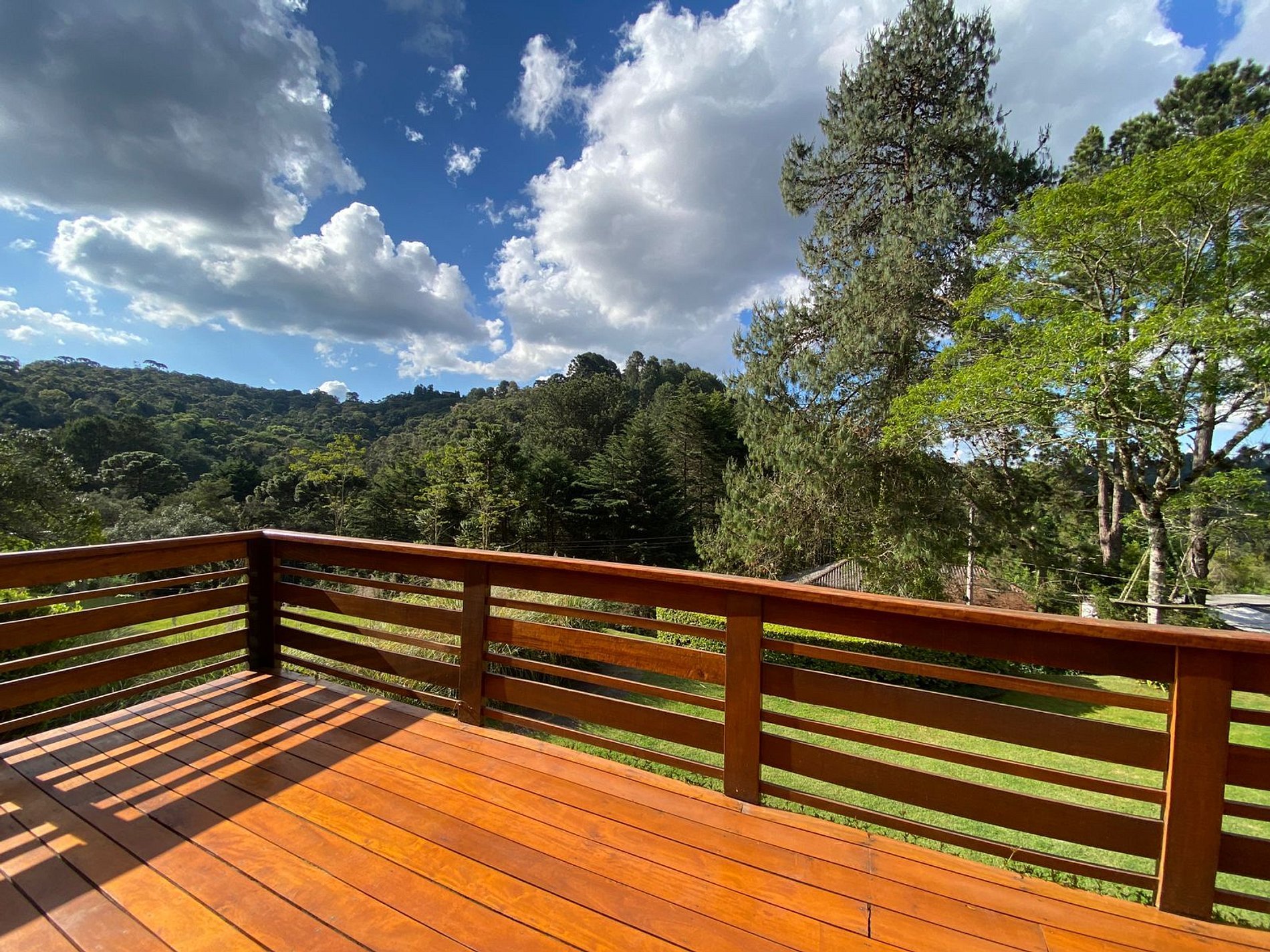Belo jardim, deck espaçoso com churrasqueira e pula-pula para crianças e com vista para uma belíssima paisagem verde.
